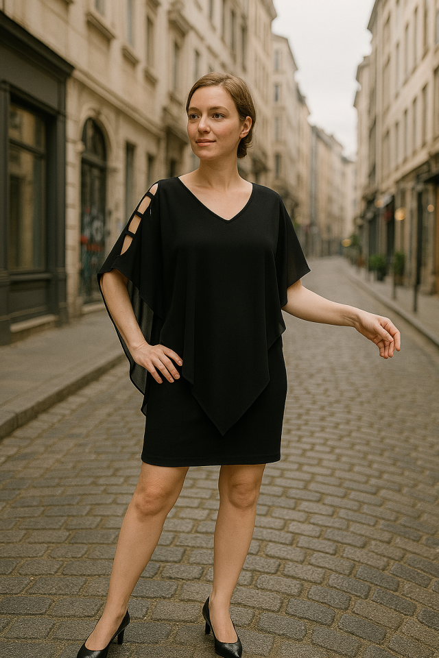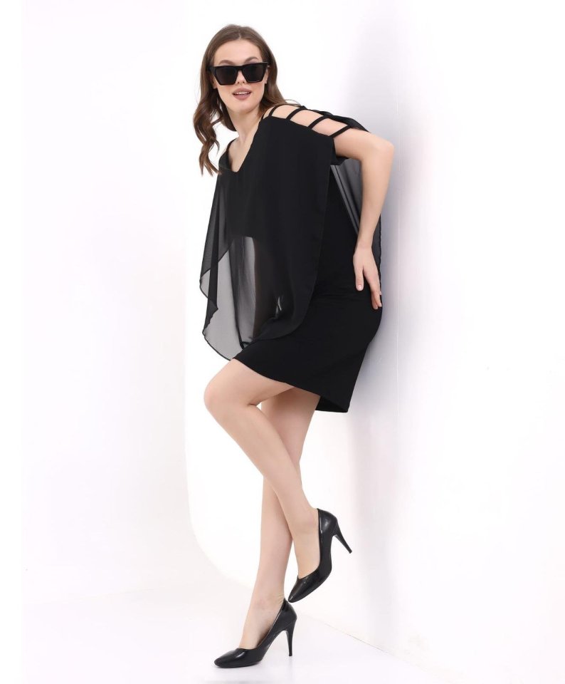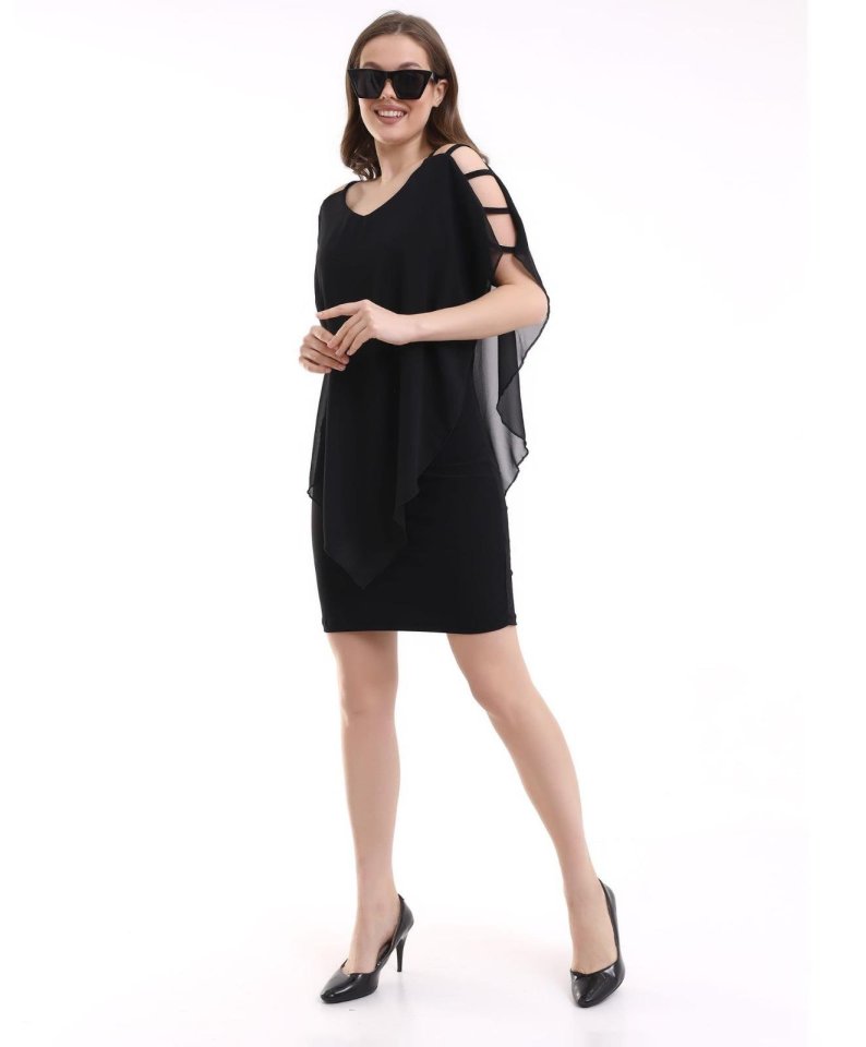 Kadın V Yaka Kolu Bağcık Detaylı Şifonlu Fırsat Ürün Diz Üstü Elbise