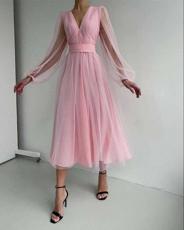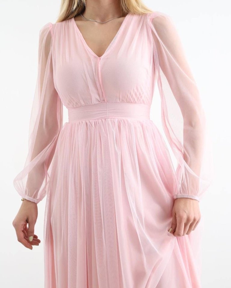 Kadın V Yaka Midi Boy Astarlı Tül Elbise