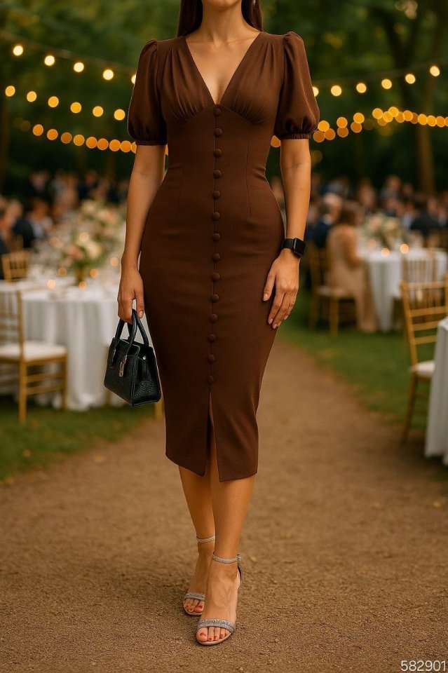Kadın V Yaka Önü Düğmeli Sırt Pencere Dekolte Elbise