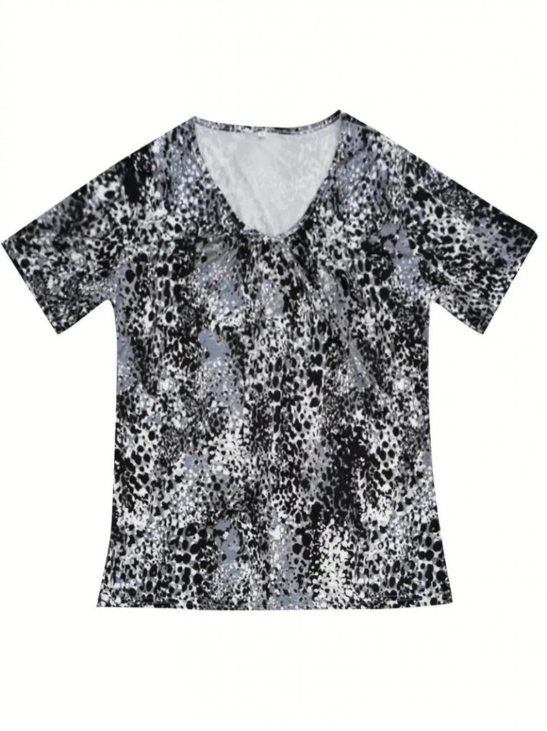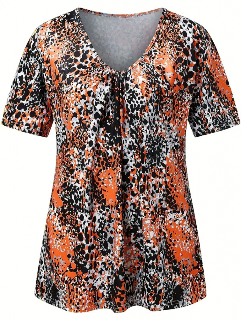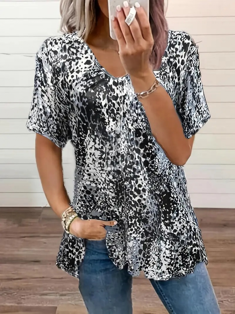 Kadın V Yaka Renkli Leopar Desen Büzgü Detay Süprem Bluz