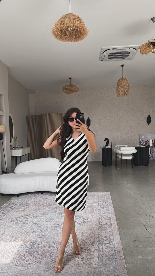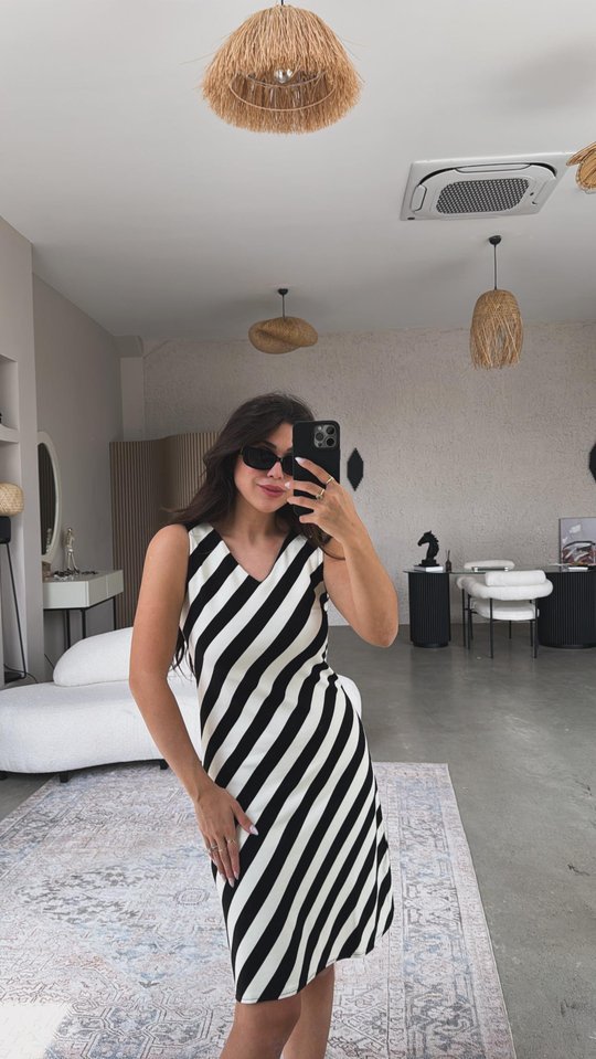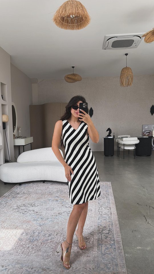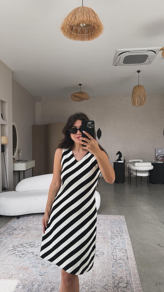 “Kadın V Yaka Sıfır Kol Diz üstü çizgi Desenli Elbise” için yorum yapan ilk kişi siz olun