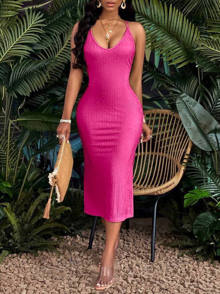 Kadın V Yaka Sırt Dekolte Detaylı Askılı Midi Boy Elbise