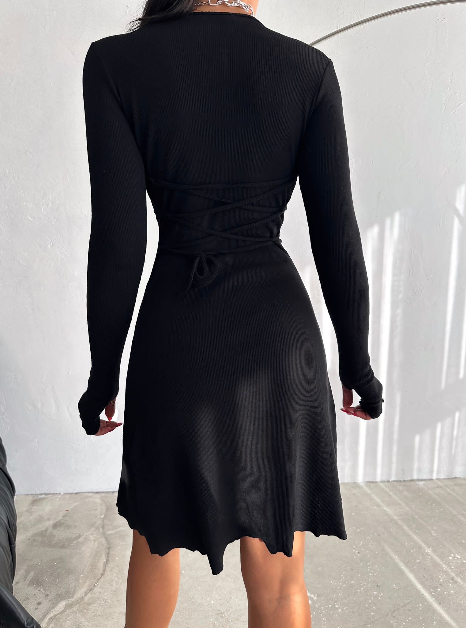 Kadın V Yaka Uzun Kollu Sırtı Ayarlanabilir Kopça Detay Kaşkorse Mini Elbise