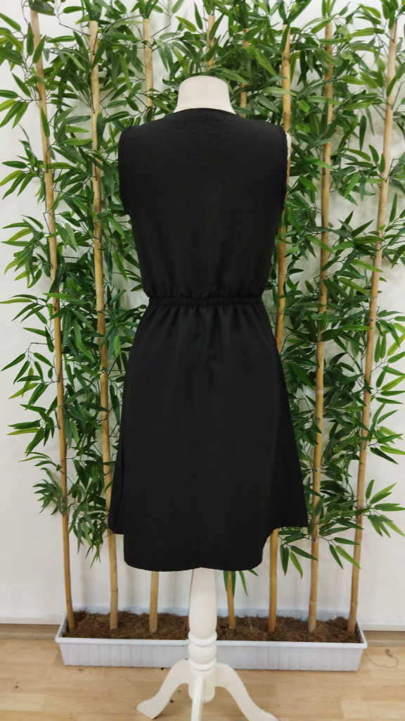 Kadın V Yakalı önden Düğme Detay Beli Lastikli Keten Kısa Elbise