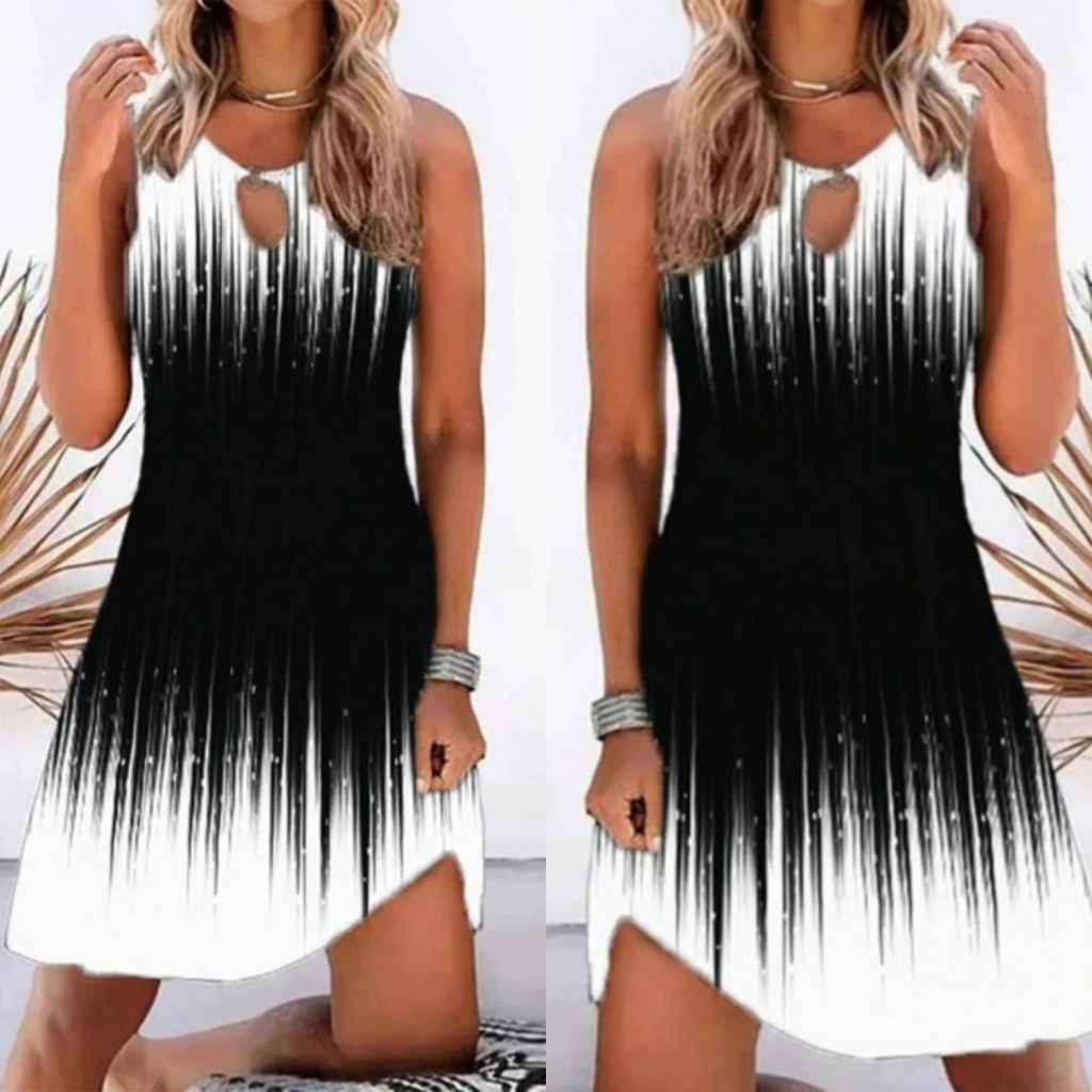 Kadın Yaka Damla Dekolteli Siyah Beyaz Desenli Dalgıç Elbise