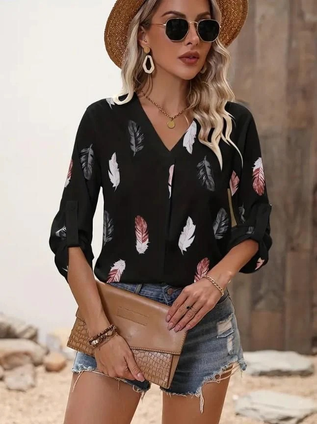 Kadın Yaprak Baskı Ayarlanabilir Fakir Kol Süper Soft Bluz