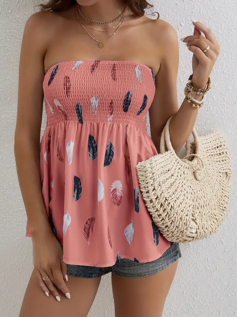 Kadın Yaprak Desenli Göğsü Gipeli Mosskrep Straplez Bluz