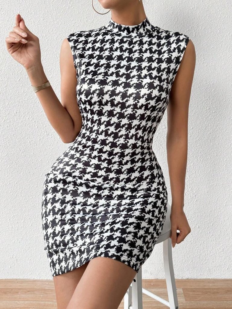 Kadın Yarı Balıkçı Yaka Kolsuz Desenli Kısa Dalgıç Elbise