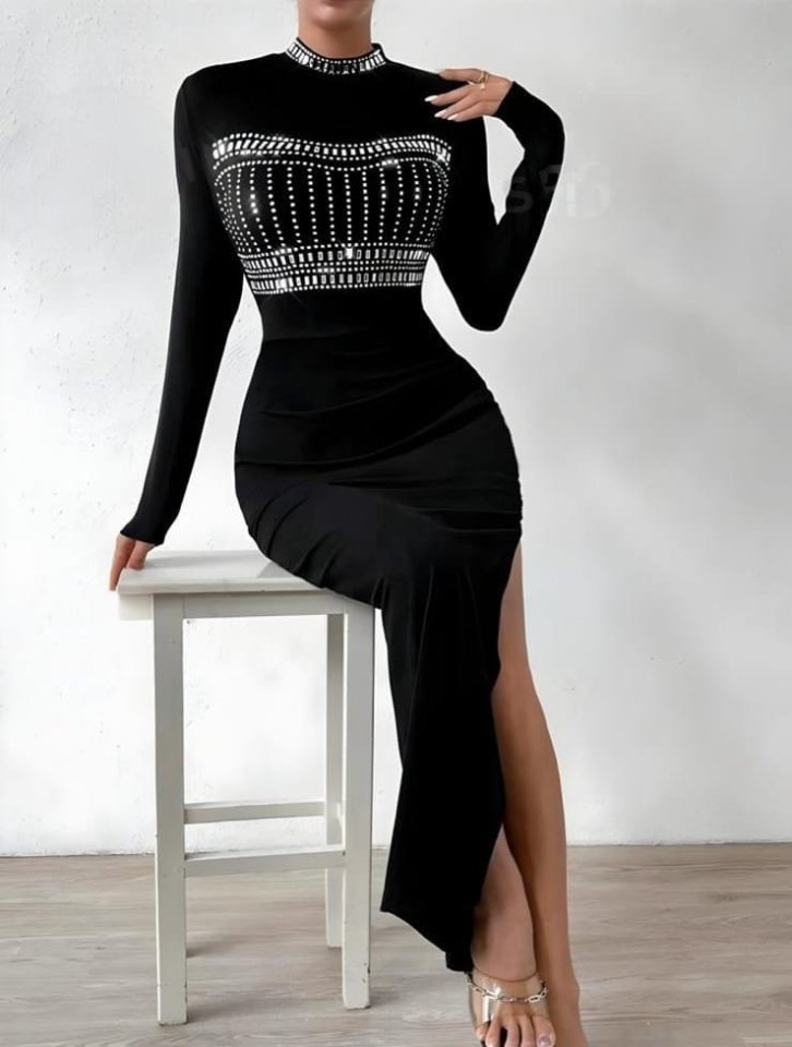 Kadın Yarım Balıkçı Yaka Taş Işemeli Bacak Dekolteli Maxi Boy Elbise
