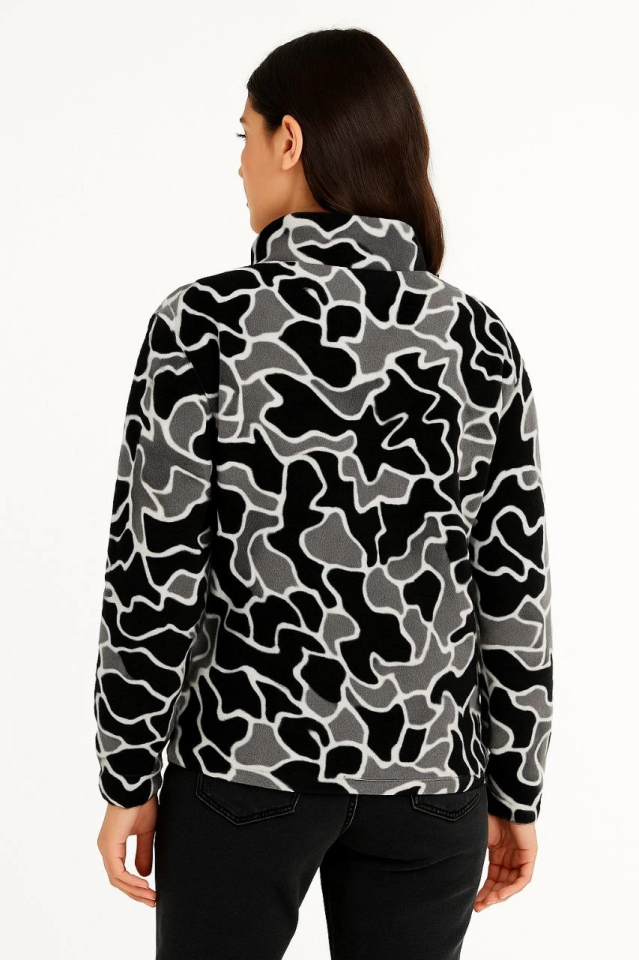 KADIN Yarım Fermuarlı Desenli Polar Sweat Yakalı, Uzun Kollu, Oversize Rahat Kalıp – Siyah