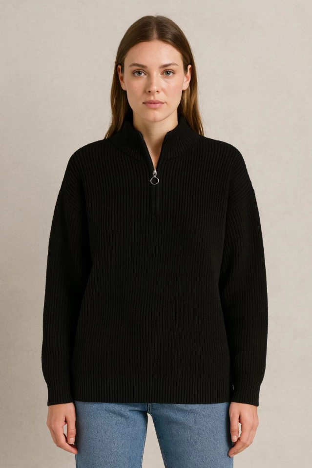 KADIN Yarım Fermuarlı Triko Kazak – Selanik Örgü, Dik Yaka, Pamuklu Dokuma, Oversize Uzun Kollu Kışlık Model – Siyah