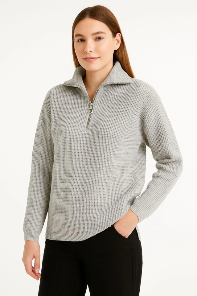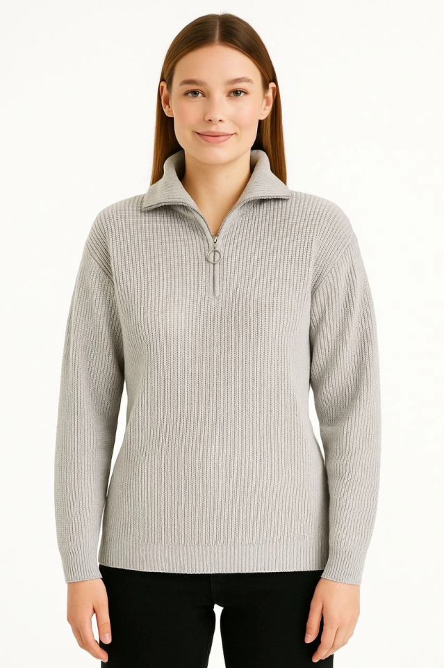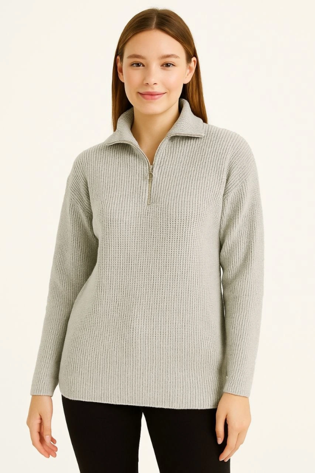 KADIN Yarım Fermuarlı Triko Kazak – Selanik Örgü, Dik Yaka, Pamuklu Dokuma, Regular Fit Uzun Kollu Kışlık Model – Gri