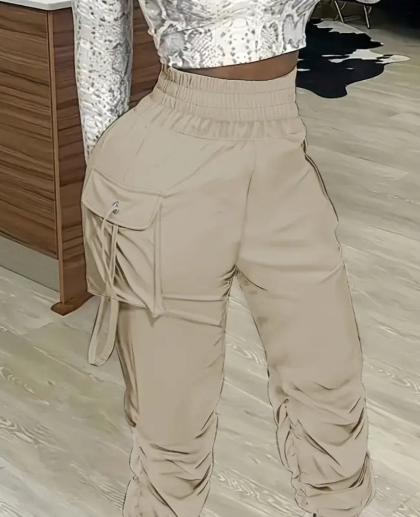 Kadın Yüksek Bel Beli Lastikli Kargo Cep Detaylı Gabardin Pantolon