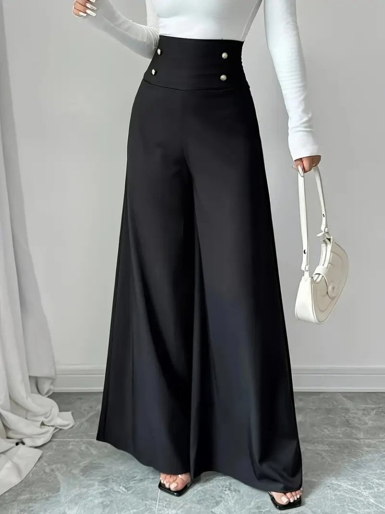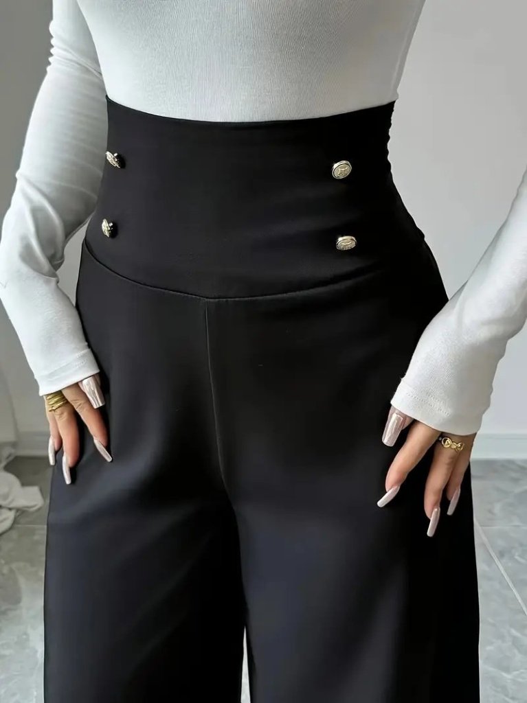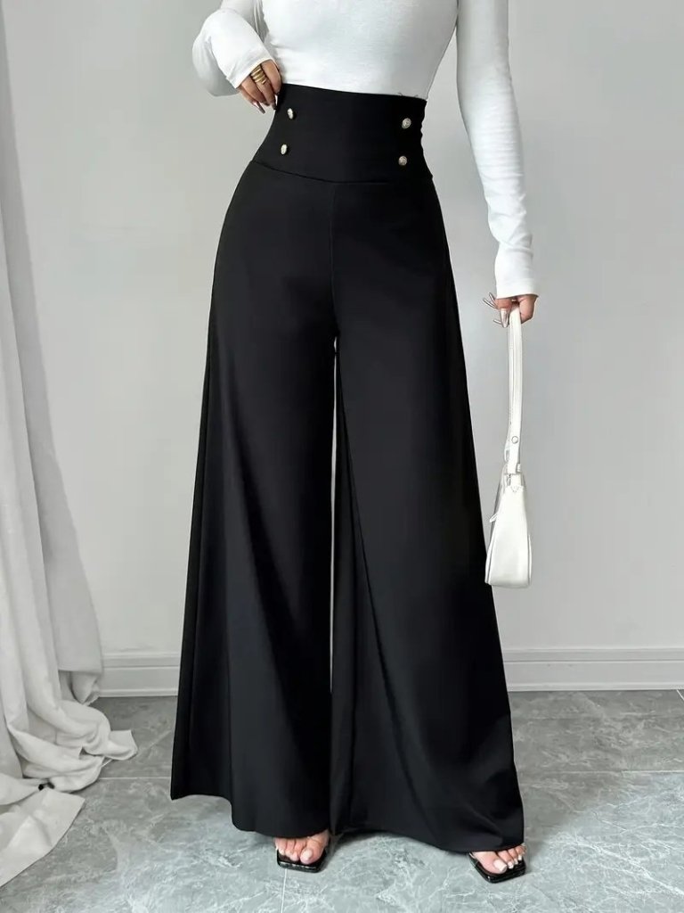 Kadın Yüksek Bel Düğmeli Geniş Paçalı Ithal Krep Pantolon