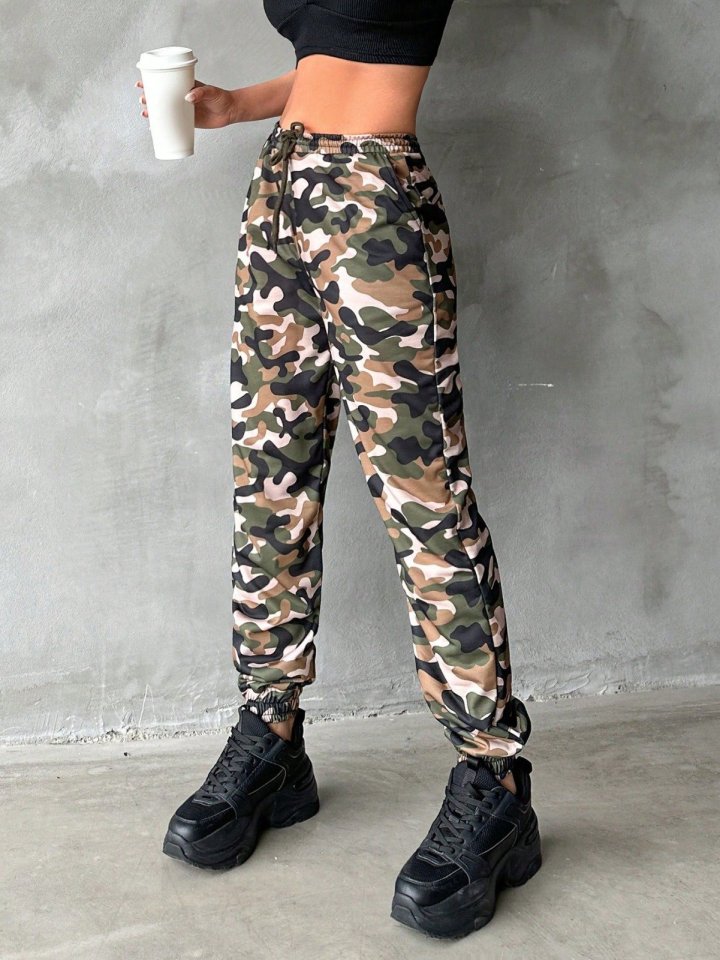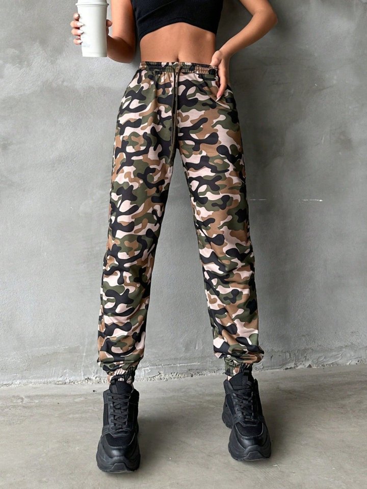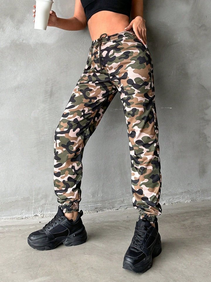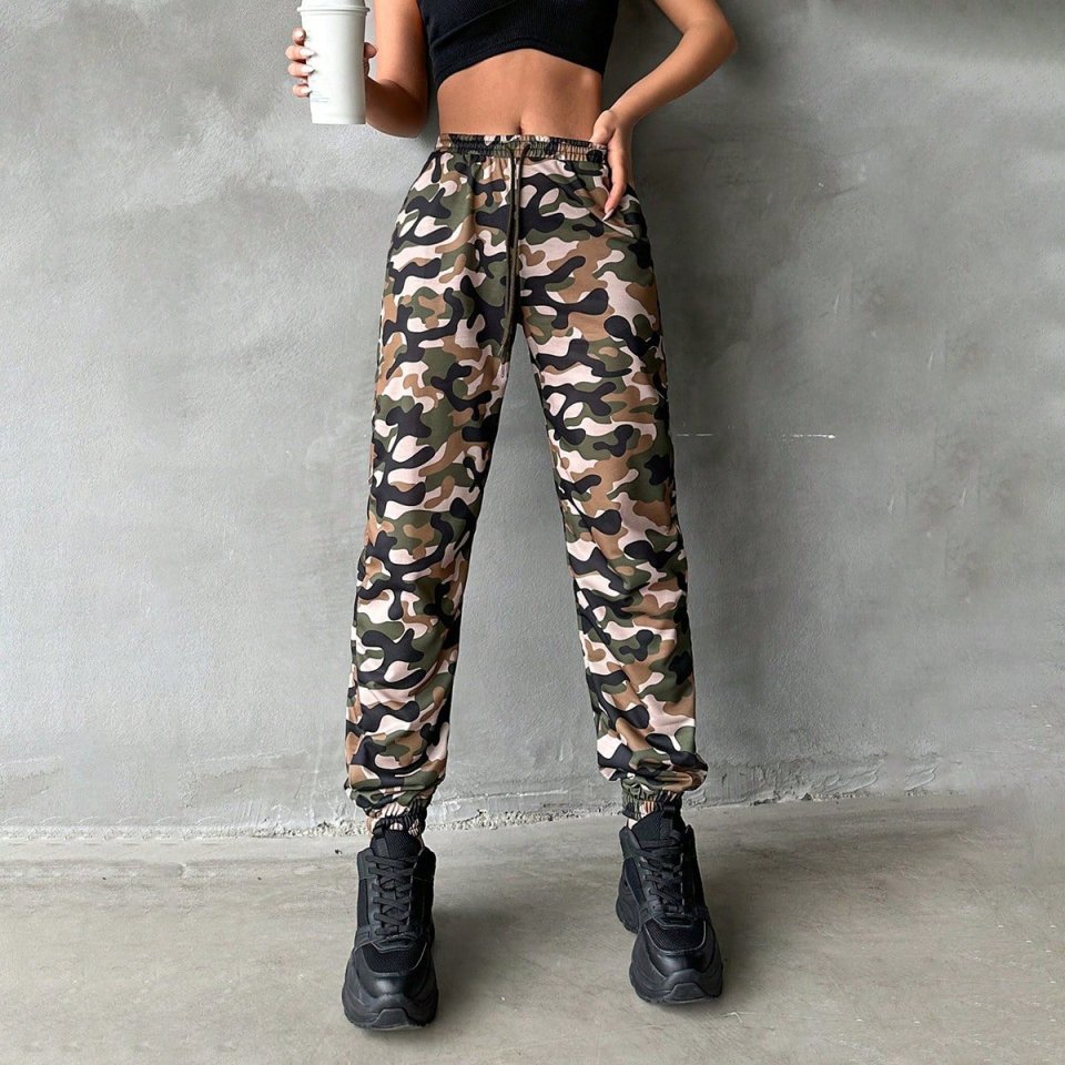 Kadın Yüksek Bel Kamuflaj Baskılı Bileği Lastik Detay İki İplik Pantolon
