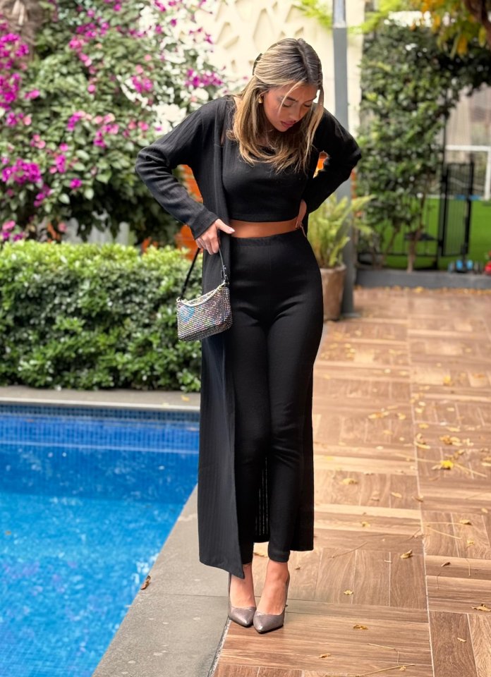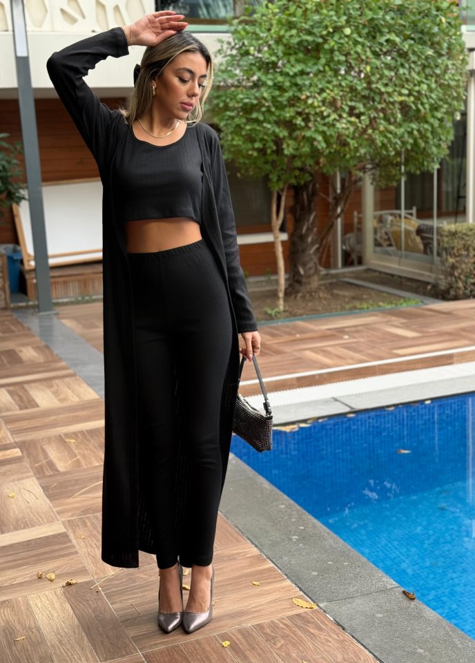 Kadın Yuvarlak Yaka Askılı Krop Bluz Yüksek Bel Tayt Ve Uzun Hırka şardonlu Kaşkorse üçlü Takım