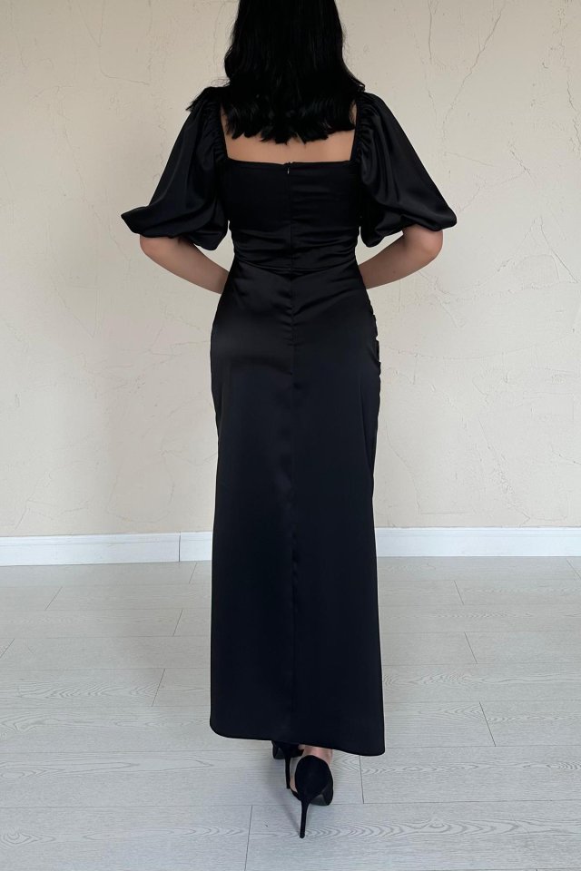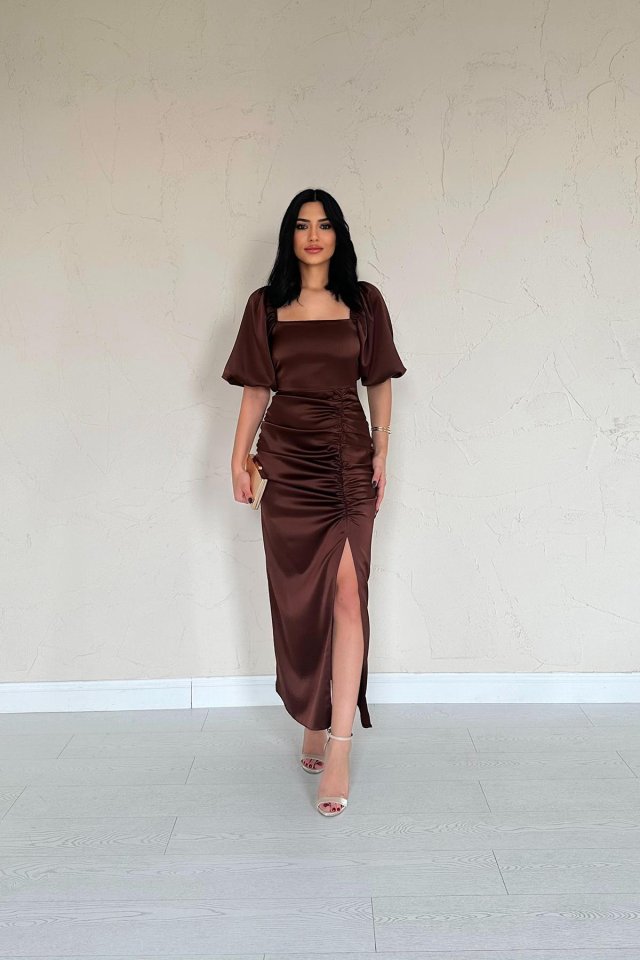 Kahverengi Büzgülü Saten Elbise