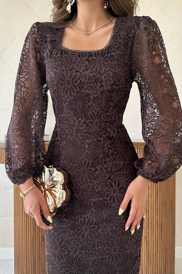 Kahverengi Güpür Detaylı Dantel Elbise