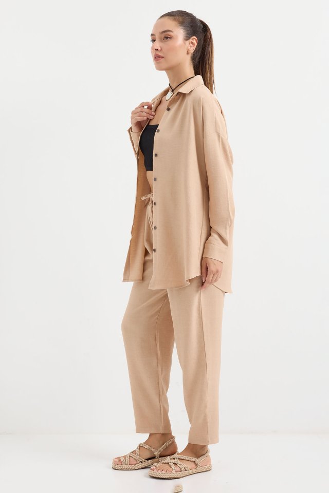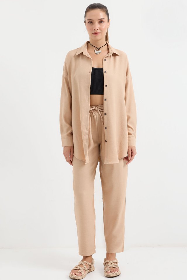 Kahverengi Oversize Keten Alt Üst Takım 6622