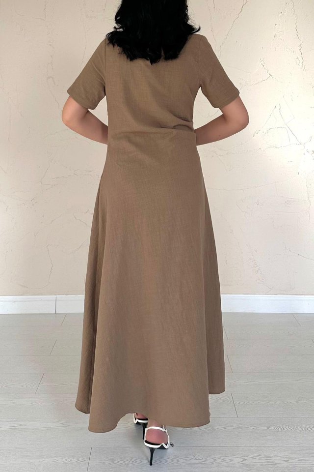 Kahverengi Pileli Bisiklet Yaka Elbise
