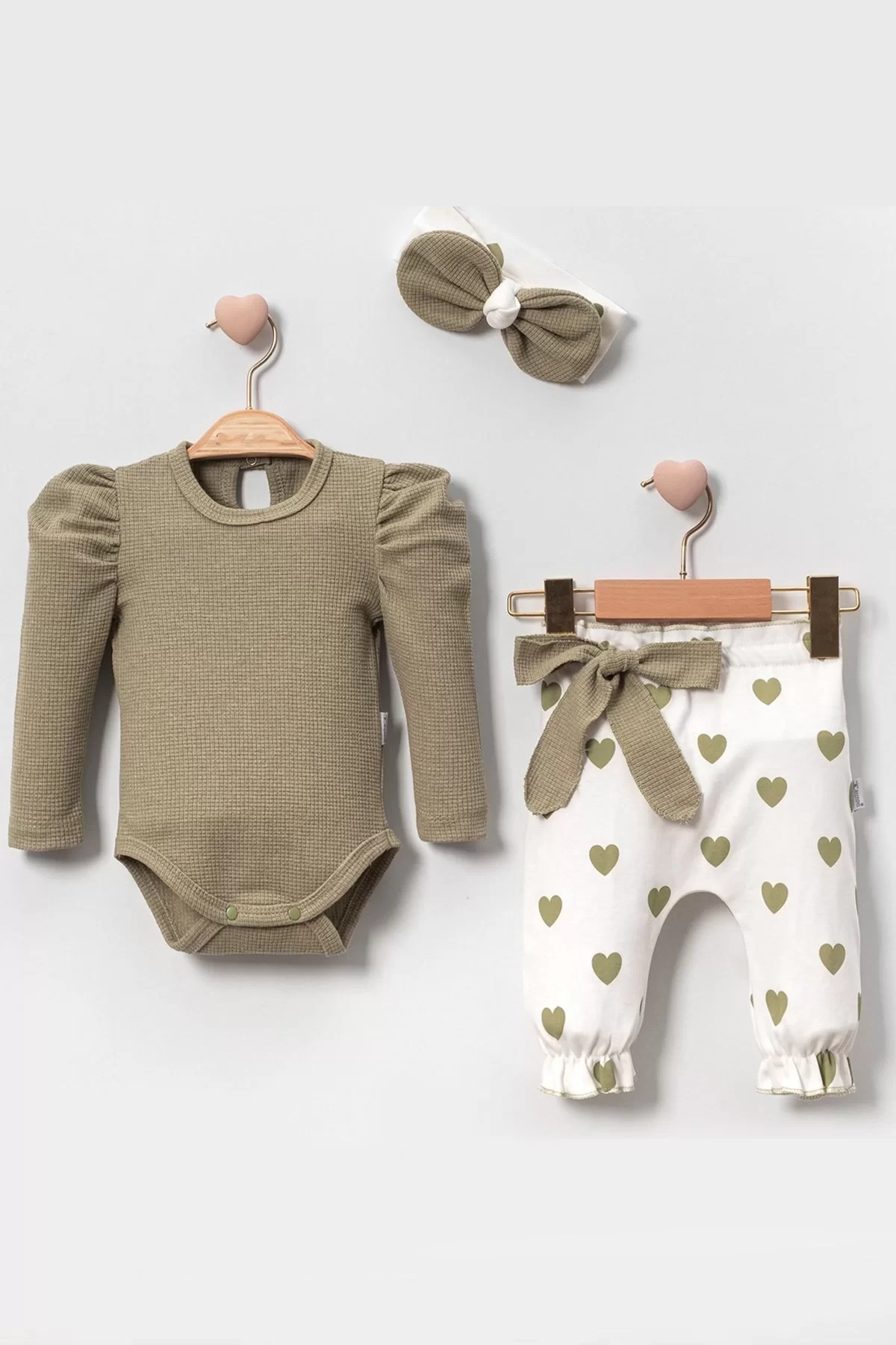 Kalp Baskılı Bandanalı 3’Lü Lüx Waffle Kız Bebek Takım
