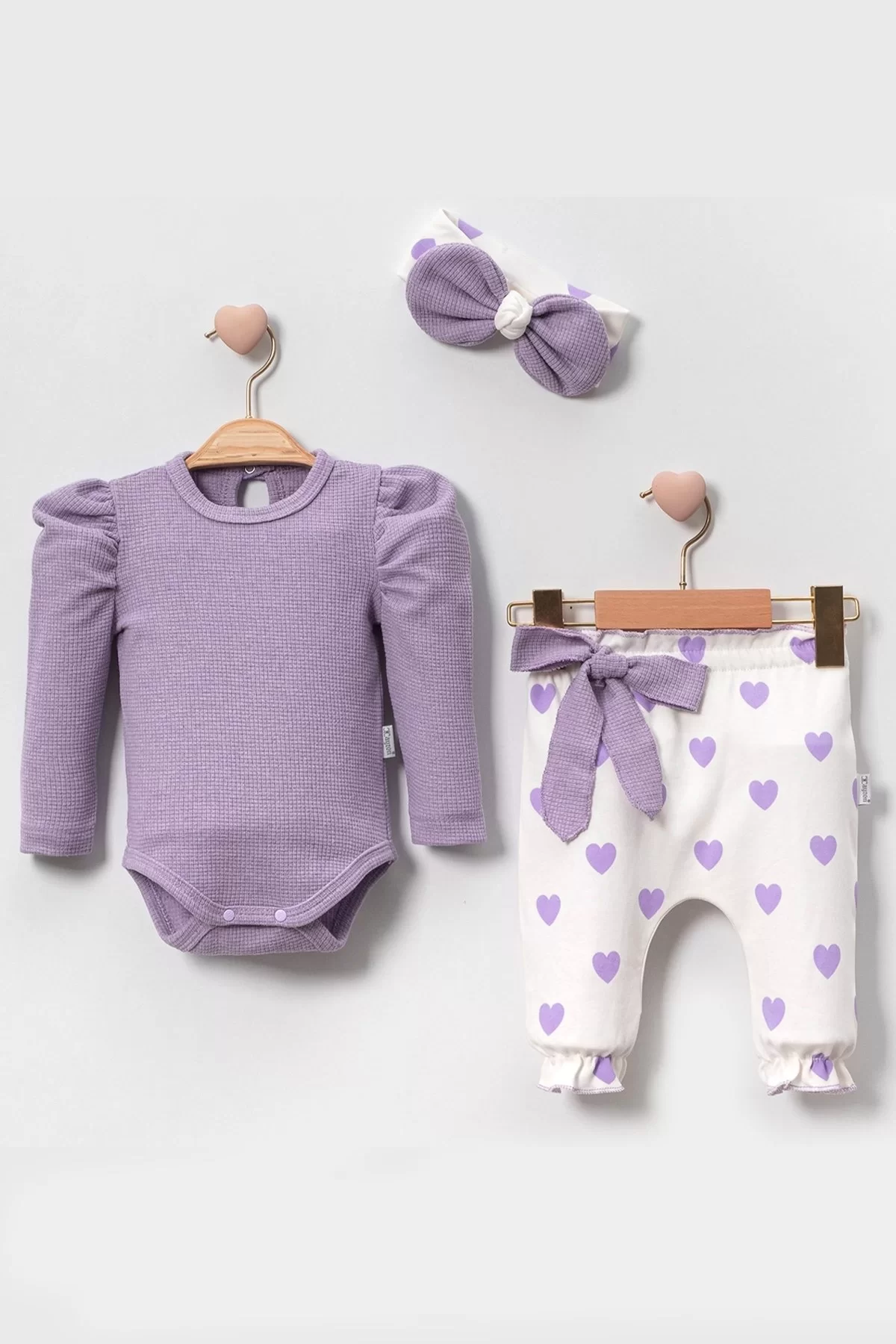 Kalp Baskılı Bandanalı 3'Lü Lüx Waffle Kız Bebek Takım.