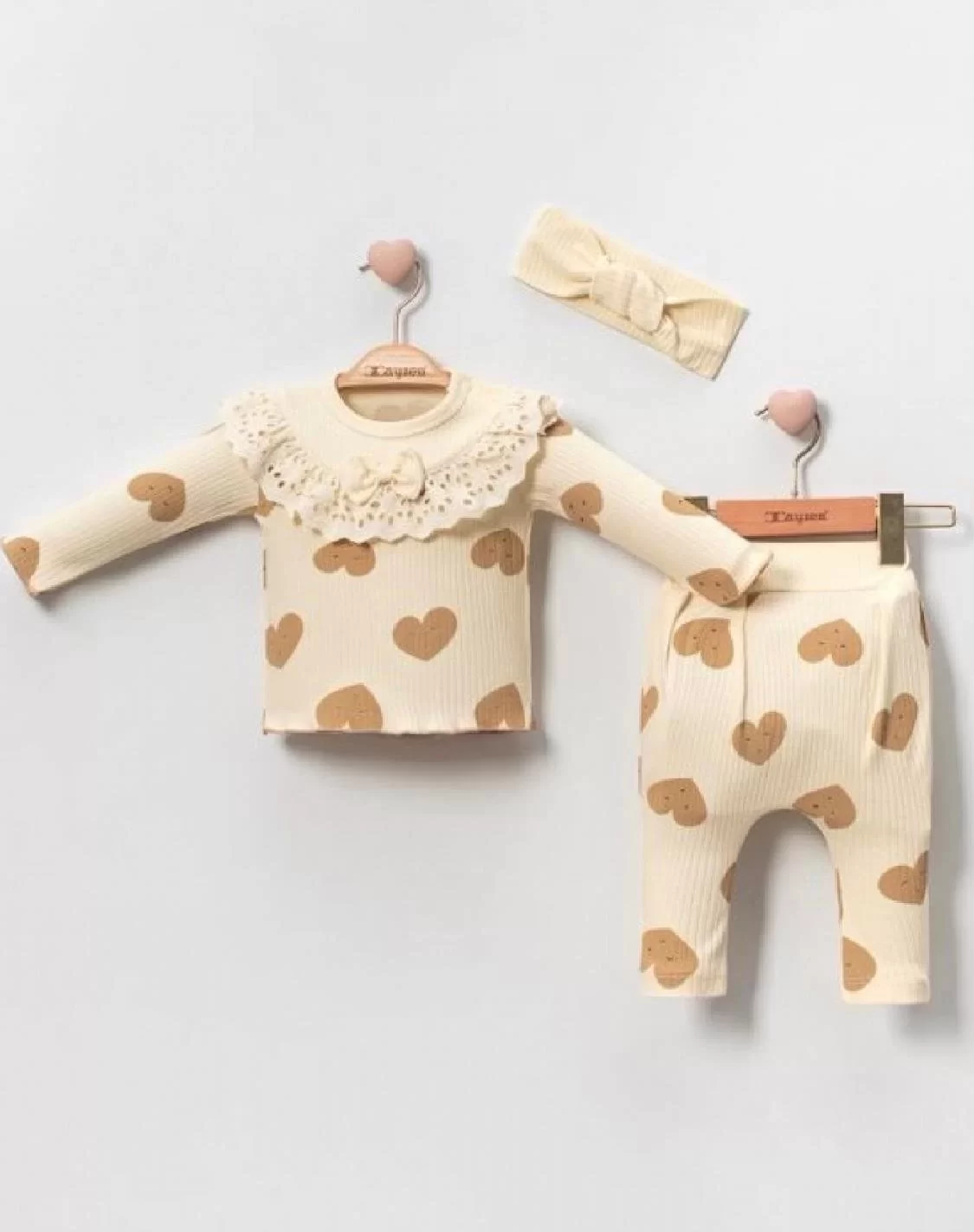 Kalp Baskılı Fisto Yaka 3 Parça Kız Bebek Takımı %100 Pamuk