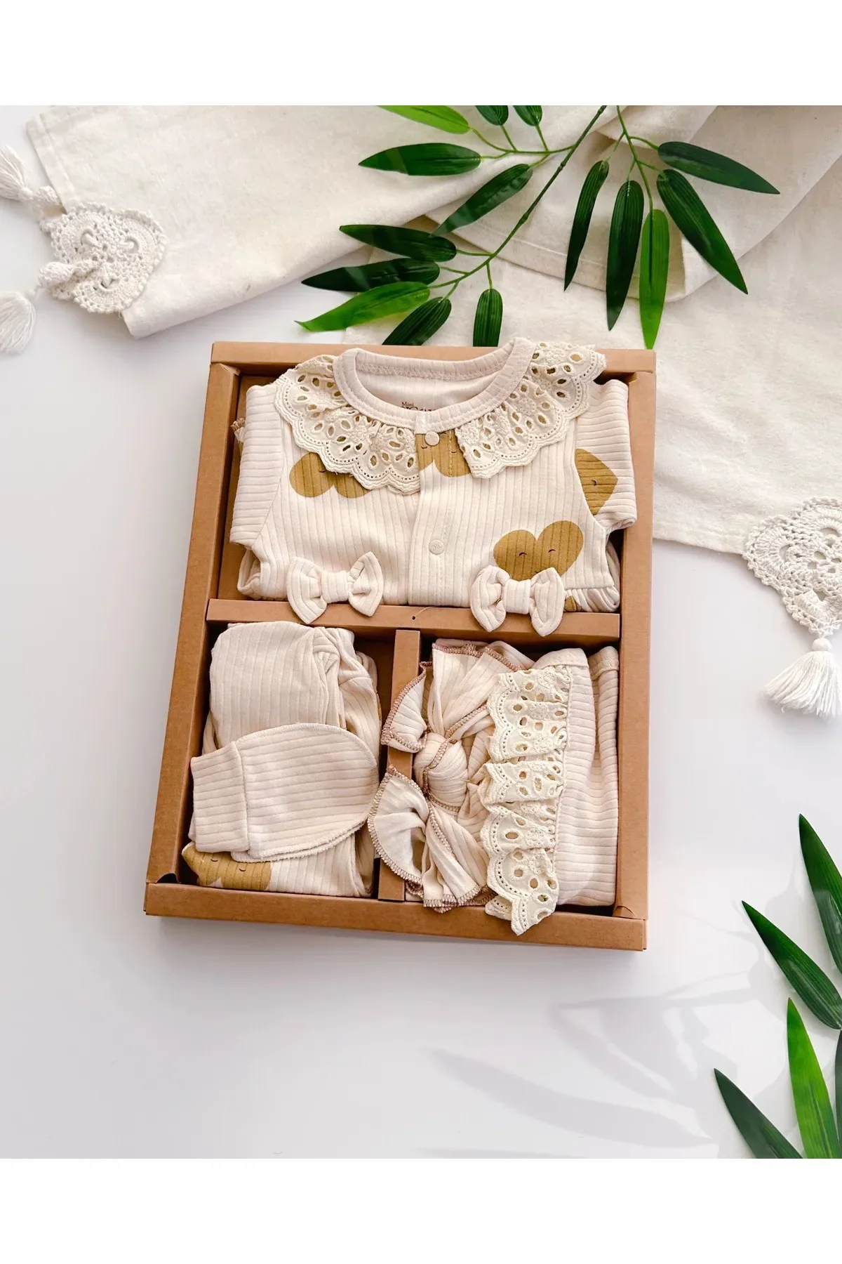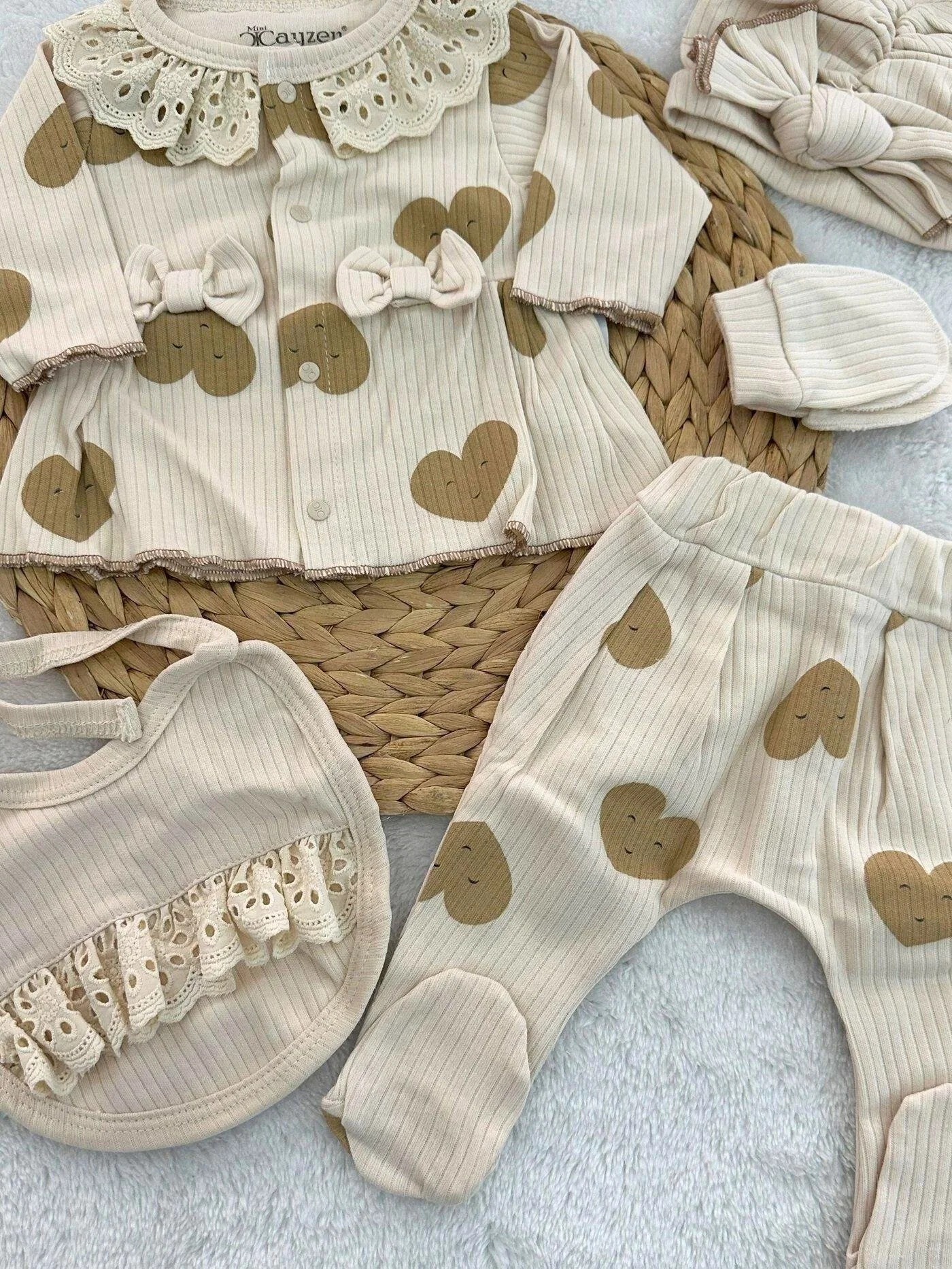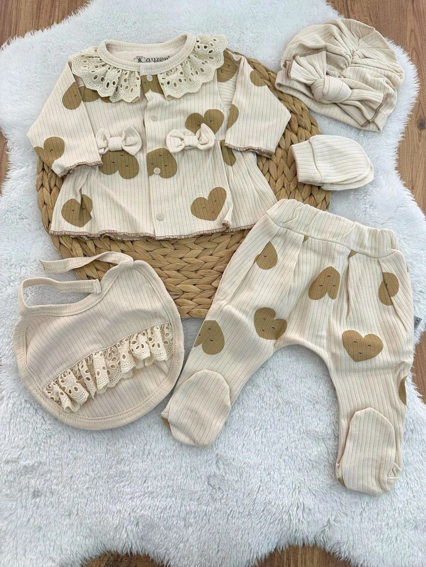 Kalp Baskılı Fisto Yaka Kutulu 5 Parça Hastane Çıkışı Zıbın Seti %100 Pamuk