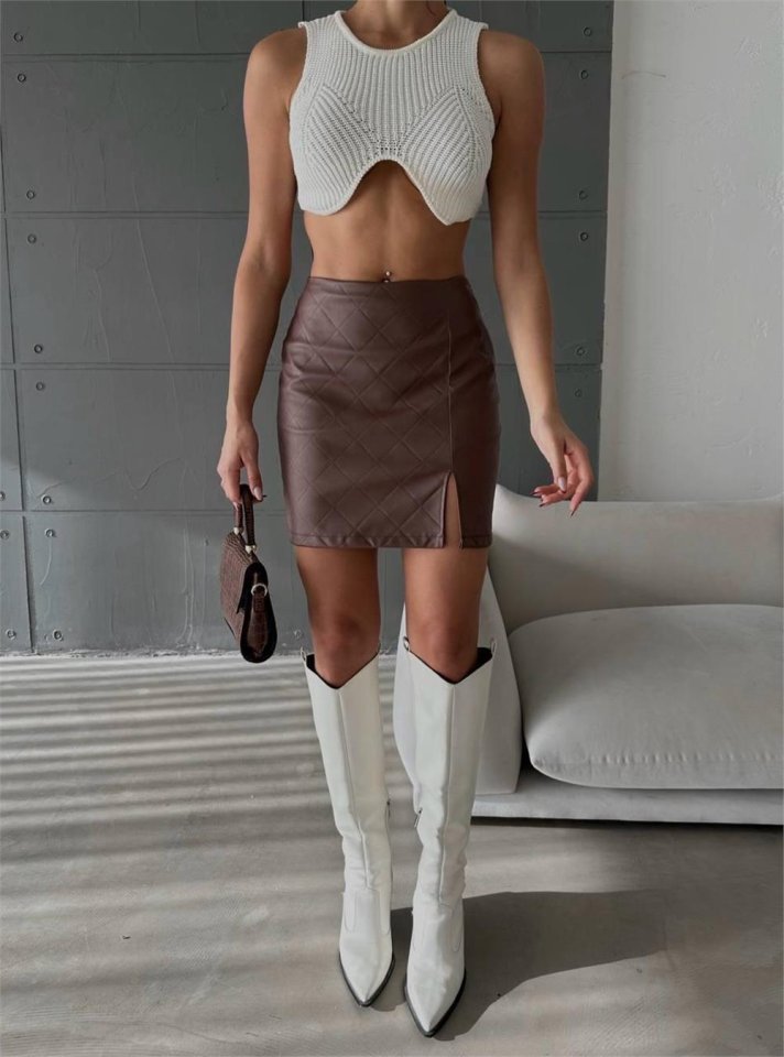 KAPİTONE DERİ ETEK YIRTMAÇLI – Kahverengi