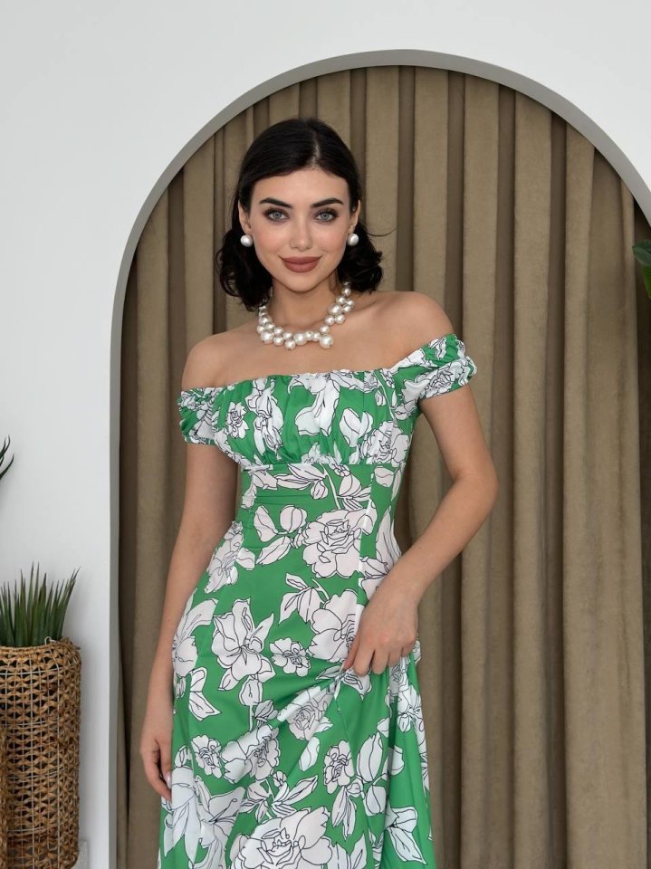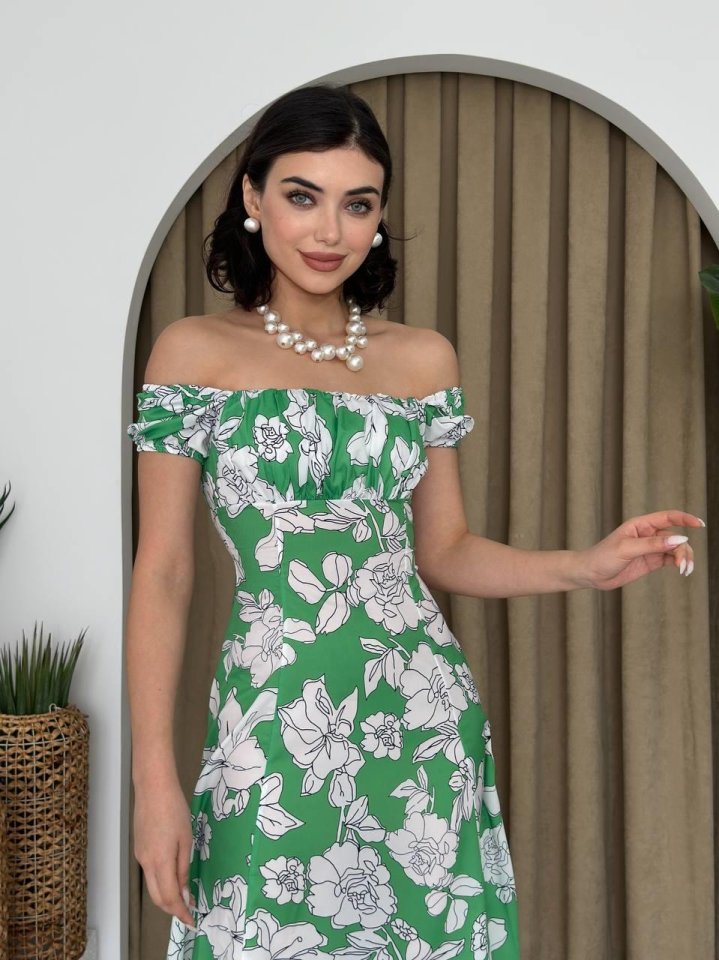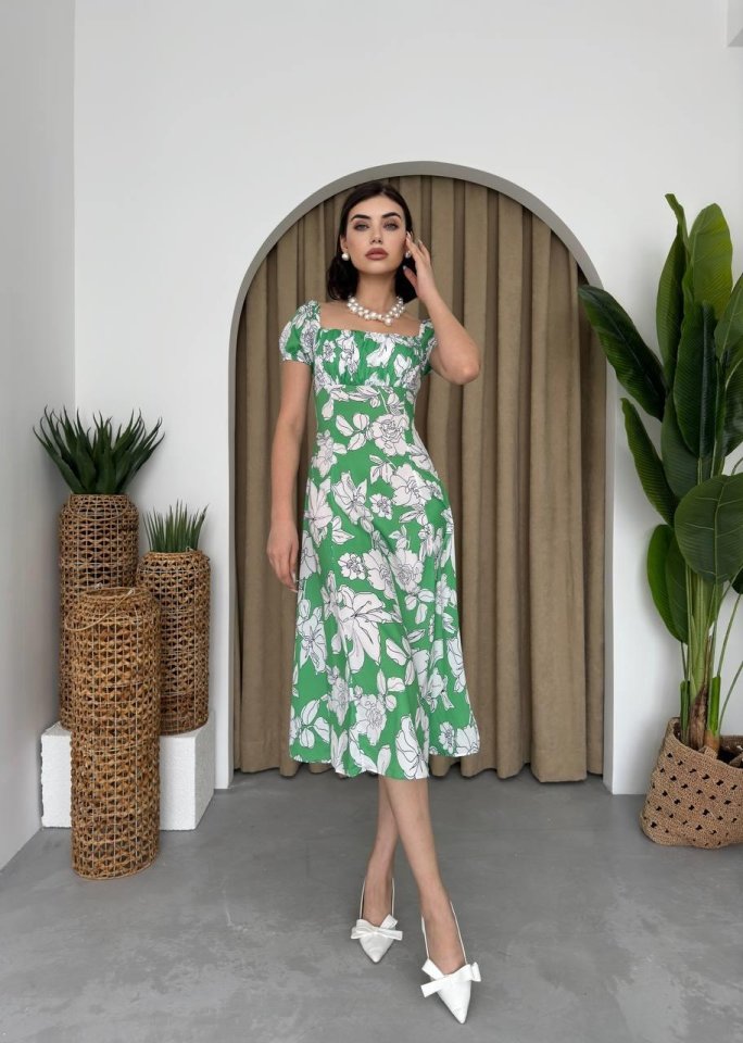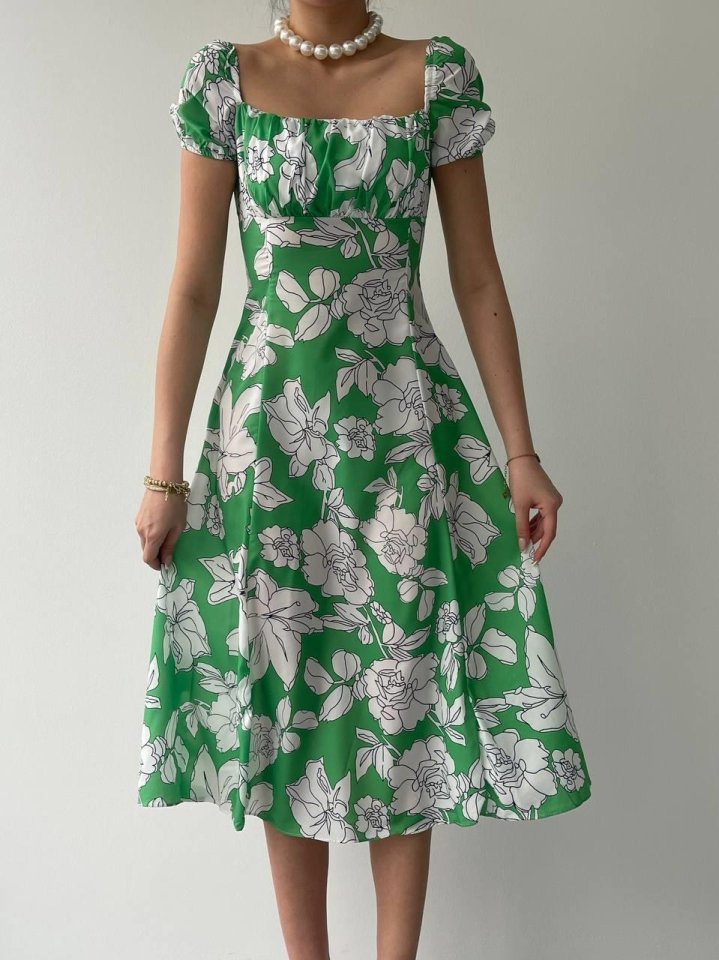 Kare Yaka Çiçekli Elbise