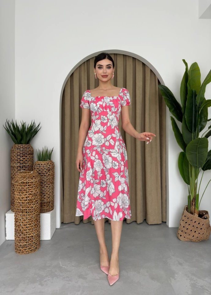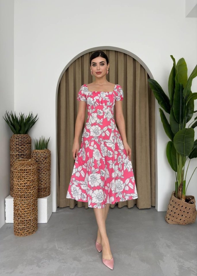 Kare Yaka Çiçekli Elbise
