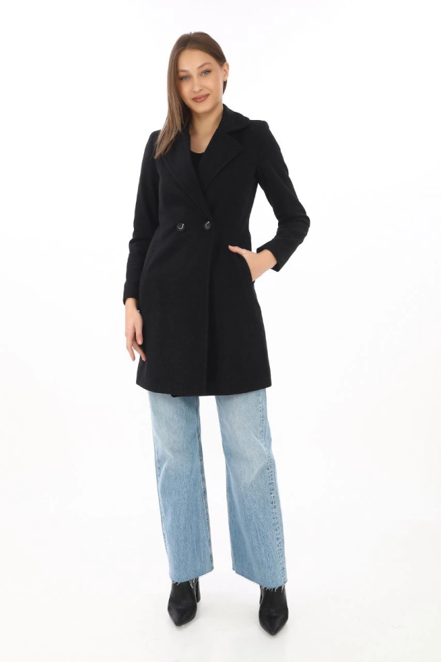 Kaşe Kaban – Siyah Yünlü Dokuma, Kruvaze Yaka, Astarlı, Cepli, Kuşaklı Uzun Boy Tesettür Uyumlu Kışlık Şık Kaban – Siyah