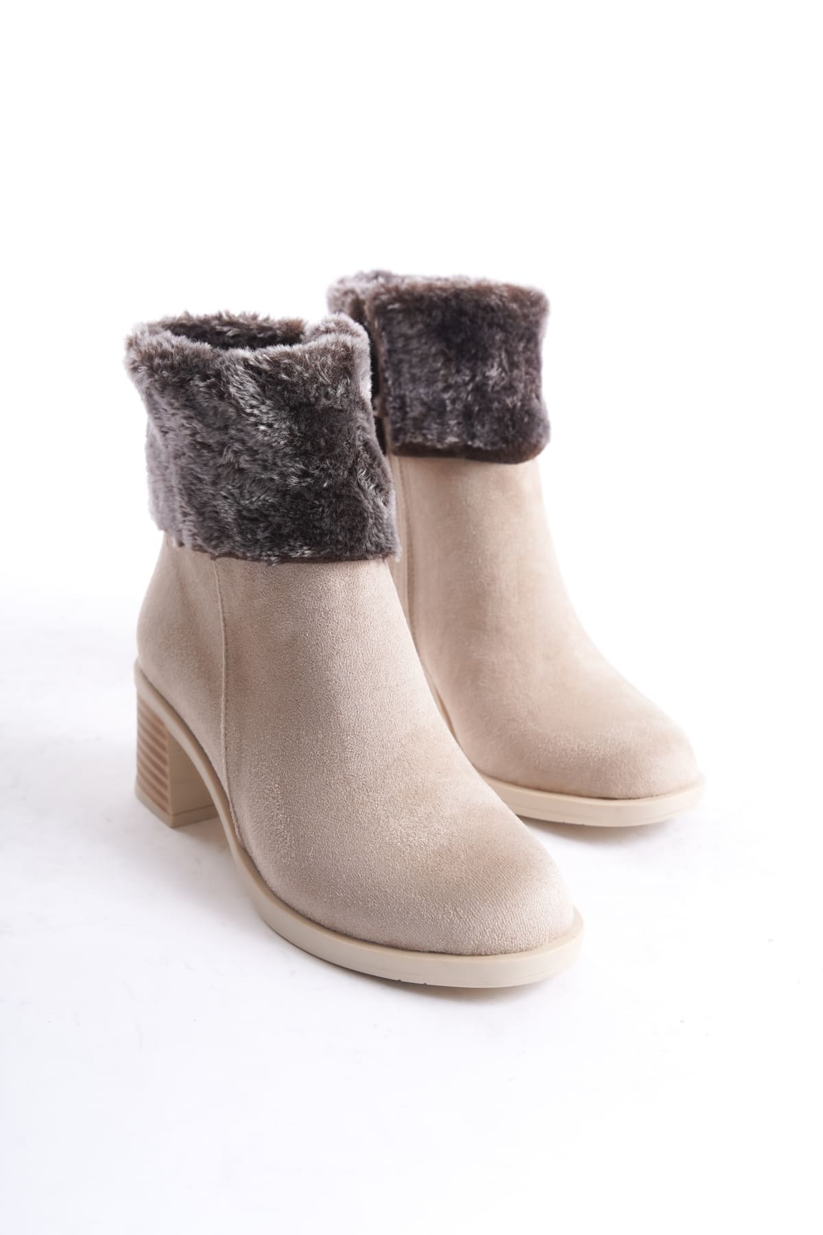 KATYA Fermuarlı Ortopedik Taban Topuklu Kürk Detaylı Süet Kadın Bot STT – Ten