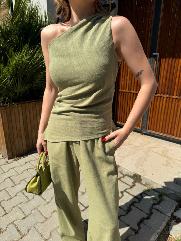 Keten Asimetrik Tek Omuzlu Bluz Pantalon Takım- Su Yeşili