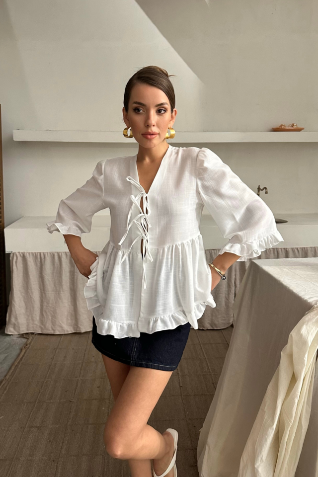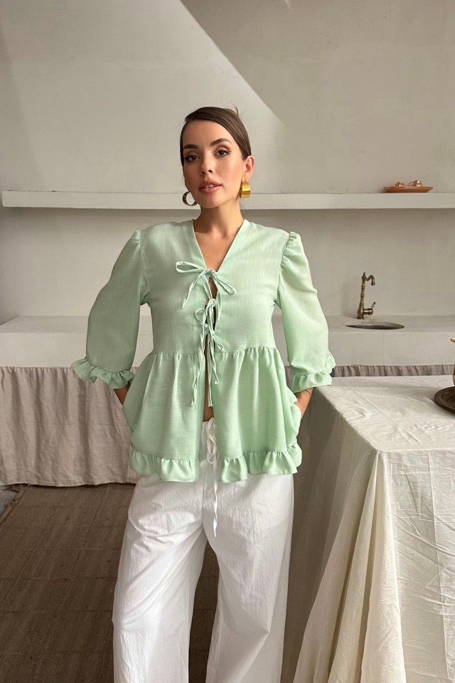 KETEN BLUZ ÖNDEN BAĞLAMALI FIRFIR DETAYLI – Yeşil