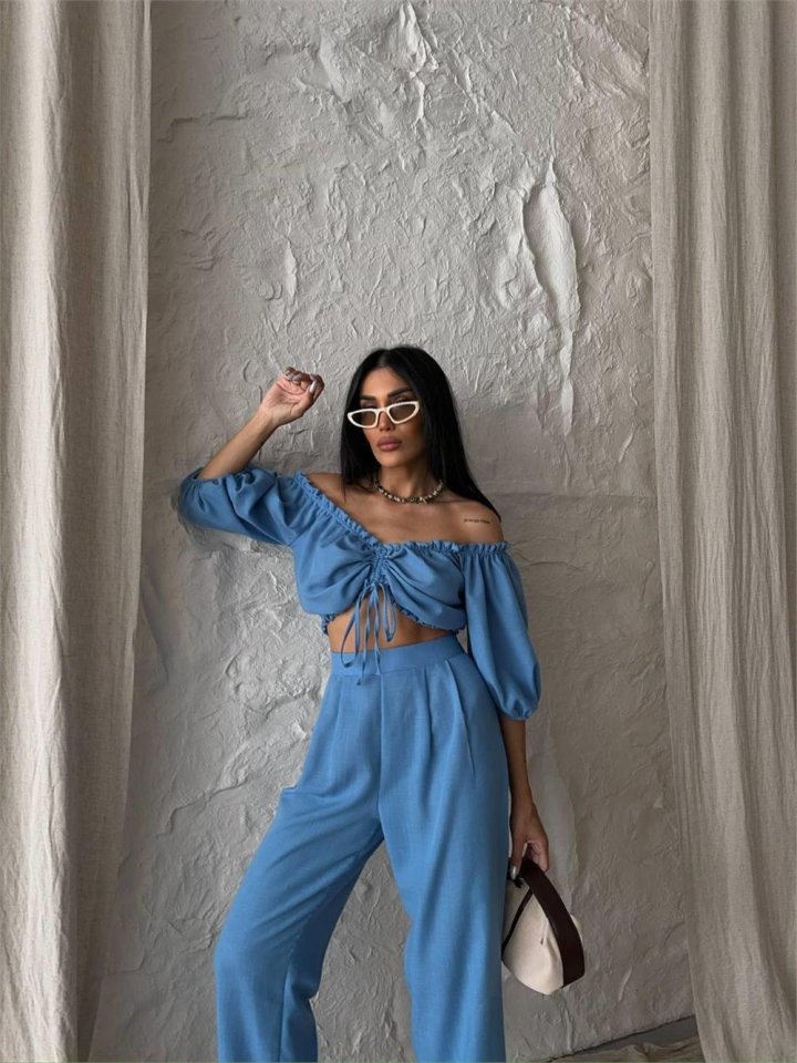 KETEN CROP BLUZ BÜZGÜ YAKA + PANTOLON TAKIM – Mavi