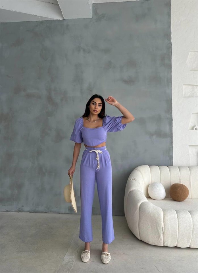 KETEN CROP KARPUZ KOL BLUZ-PANTOLON HASIR KEMERLİ – Mor
