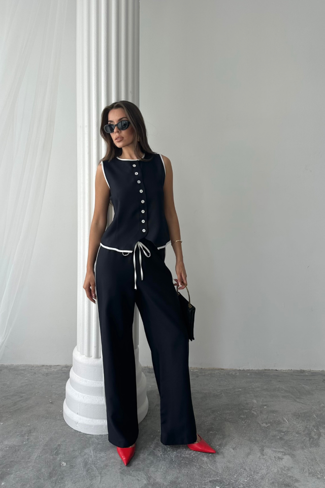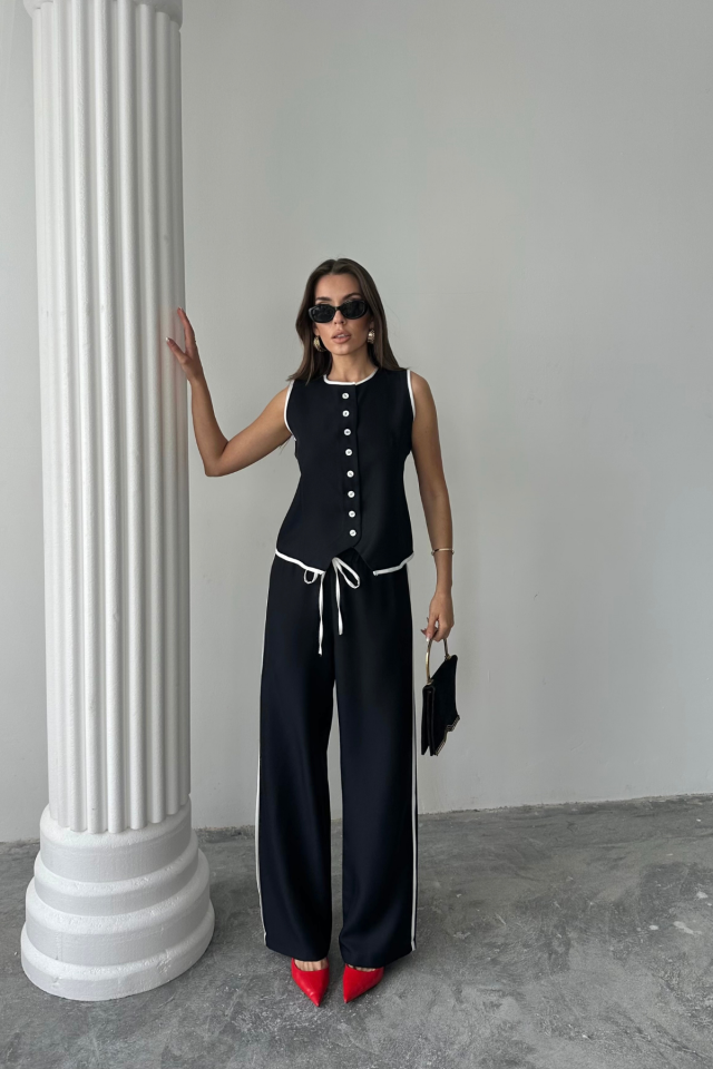 KETEN KENARLARI BİYELİ YELEK – PANTOLON TAKIM – Siyah