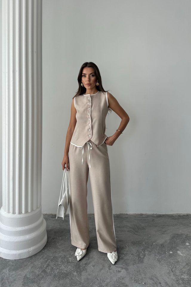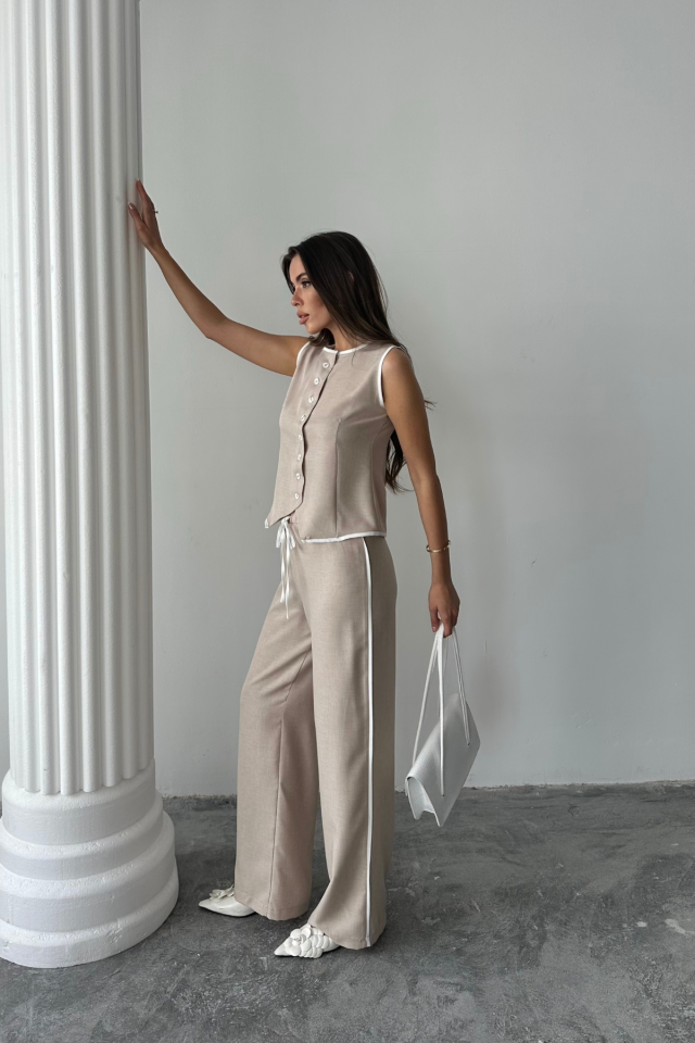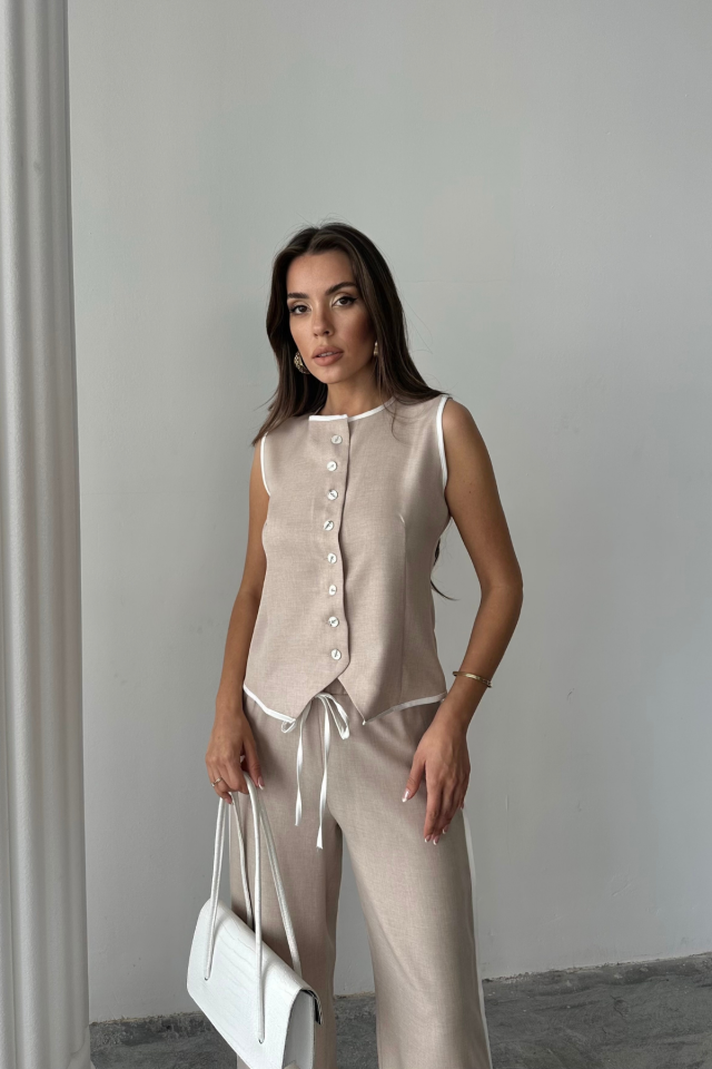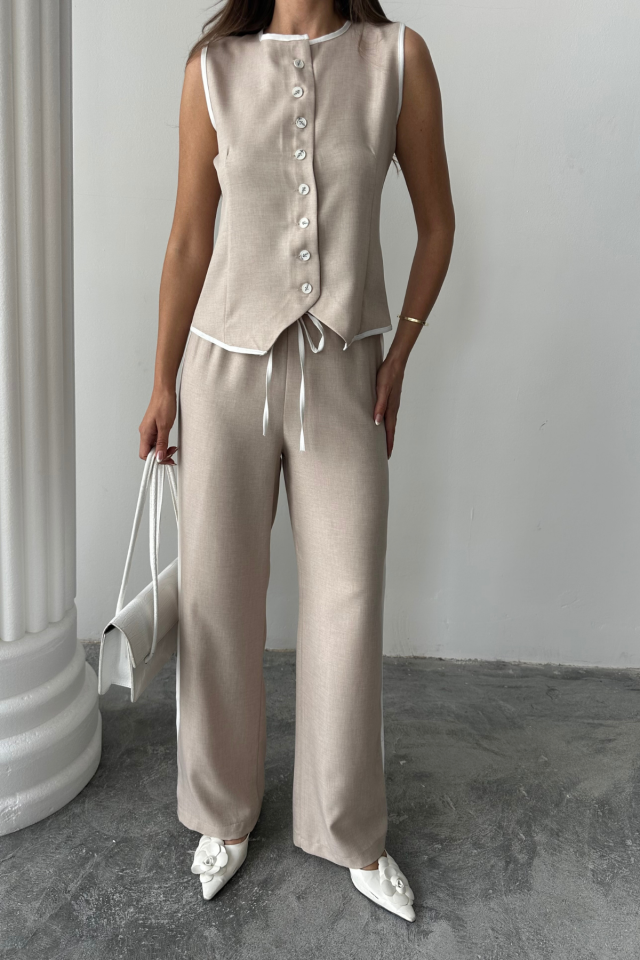 KETEN KENARLARI BİYELİ YELEK – PANTOLON TAKIM – Beyaz