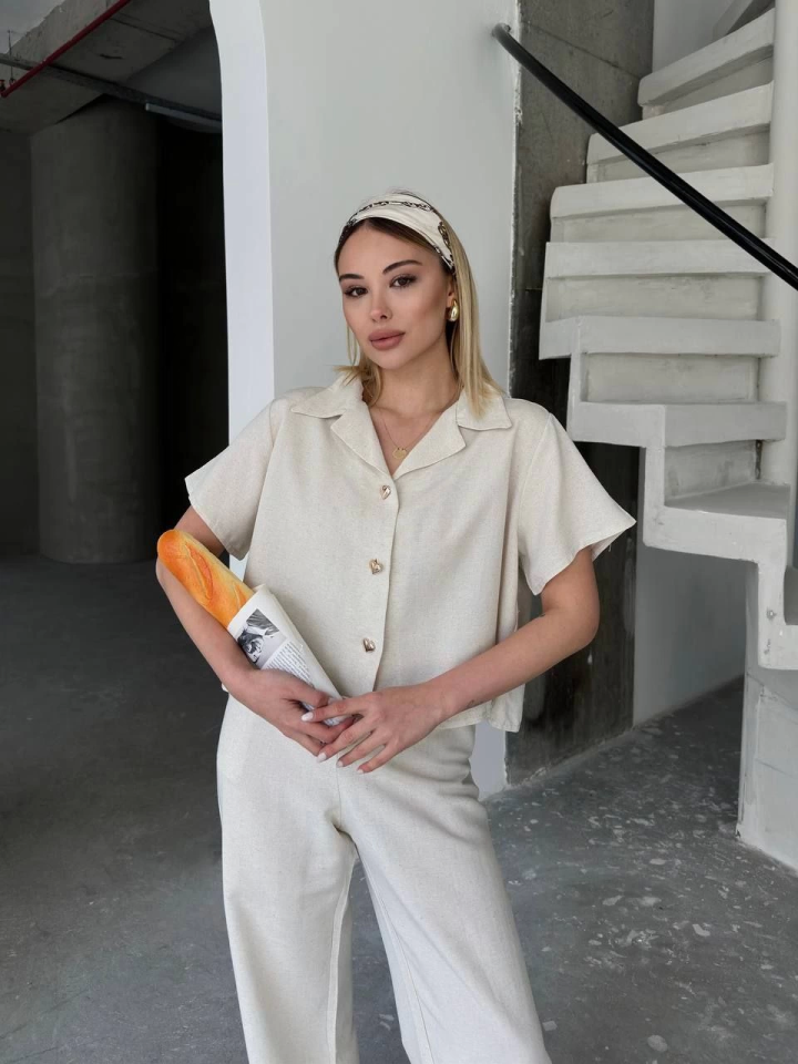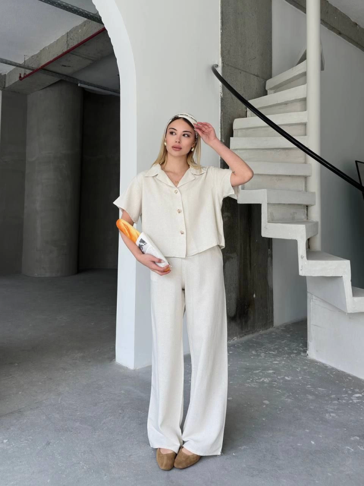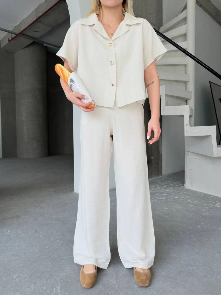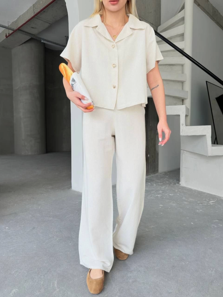 Keten Kısa Kollu Gömlek Pantolon Ikili Takım – Beyaz