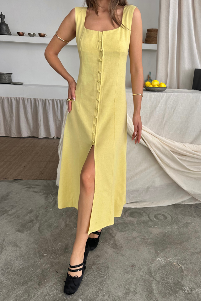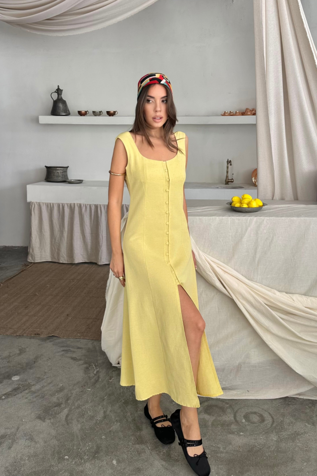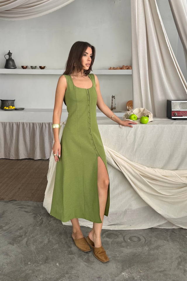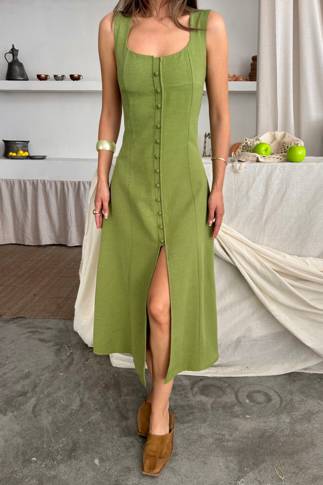 KETEN KOLSUZ KARE YAKA DÜĞME DETAYLI ELBİSE – Yağ Yeşili