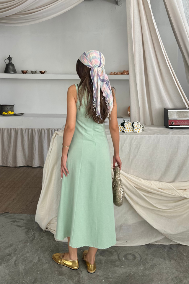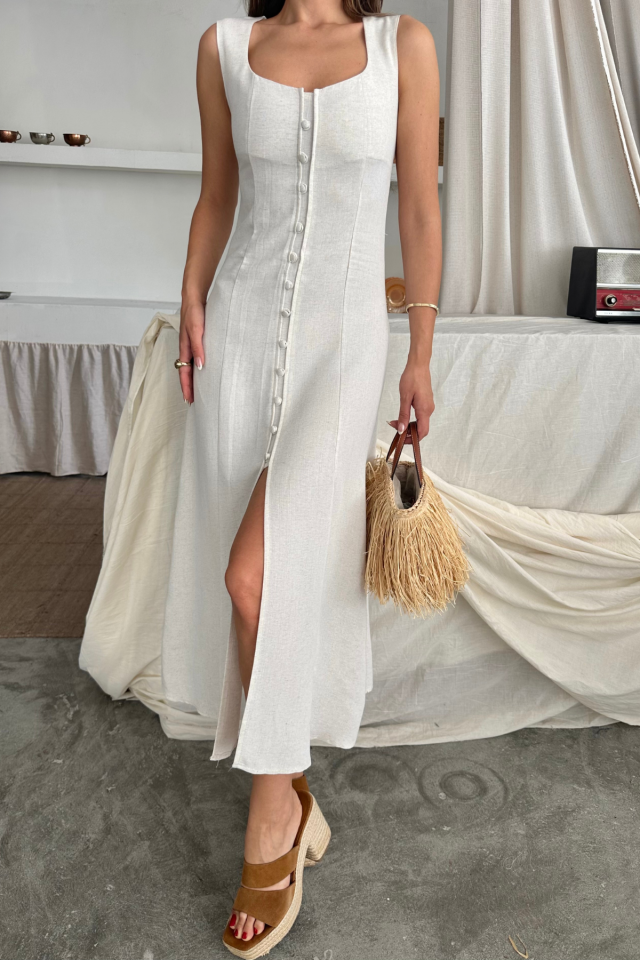 KETEN KOLSUZ KARE YAKA DÜĞME DETAYLI ELBİSE – Beyaz
