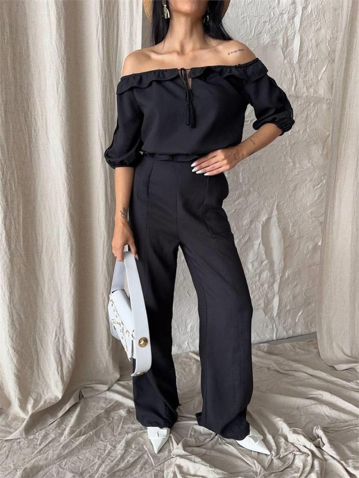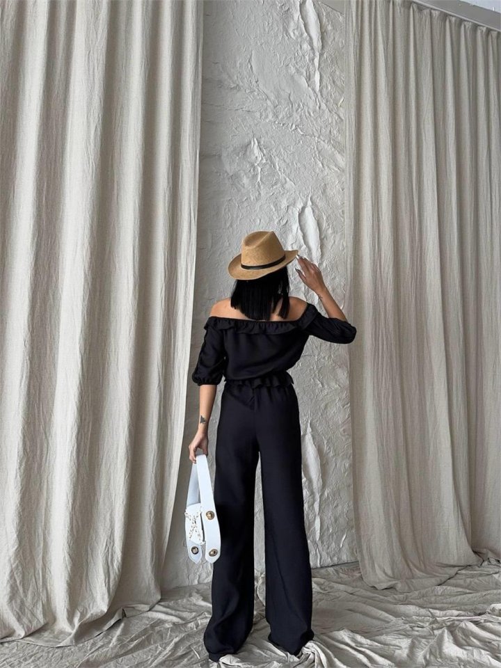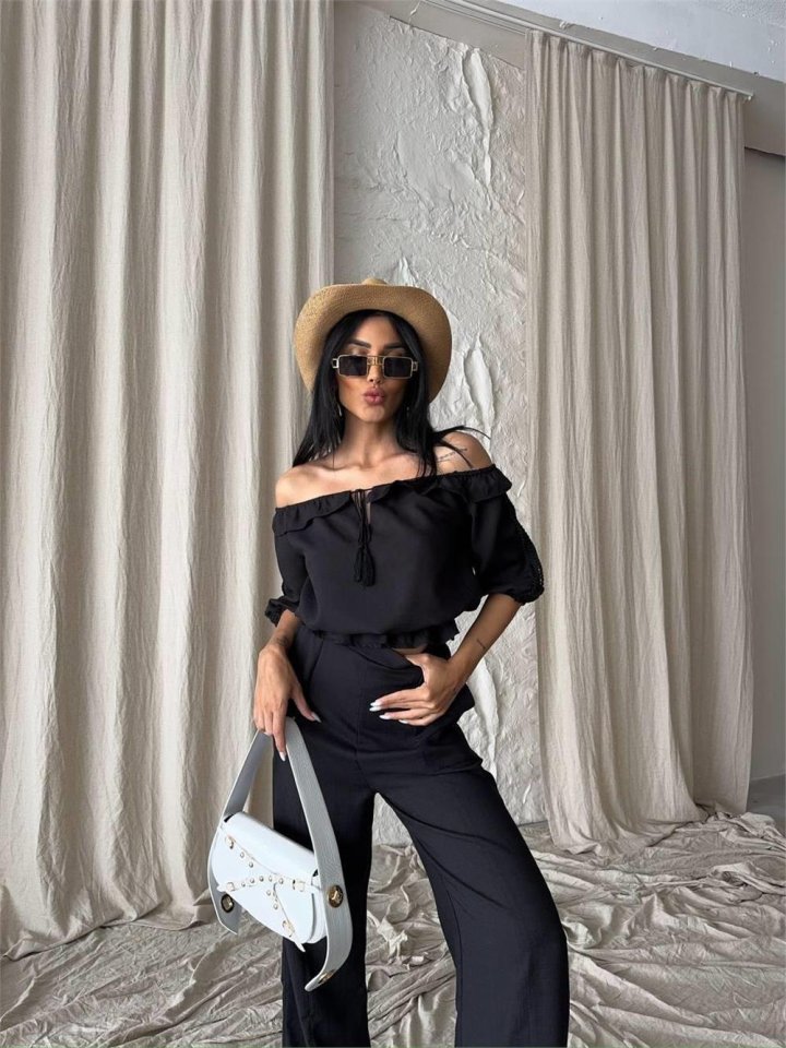 KETEN MADONNA YAKA KOL HASIR ŞERİT – PANTOLON TAKIM – Siyah
