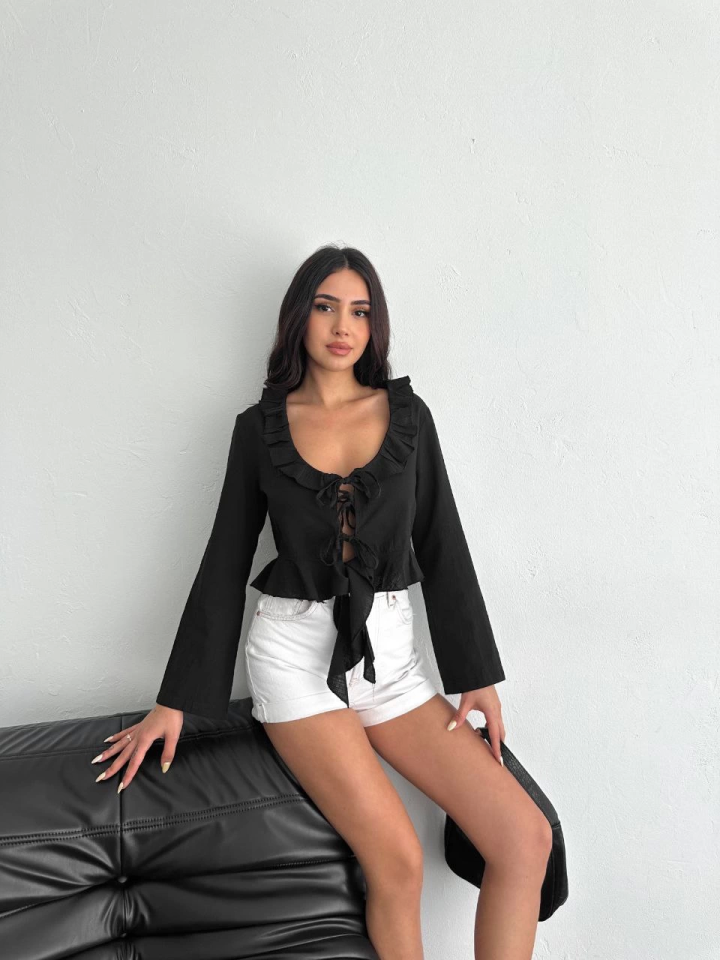 Keten Uzun Kol Bağacık Detaylı Bluz – Siyah