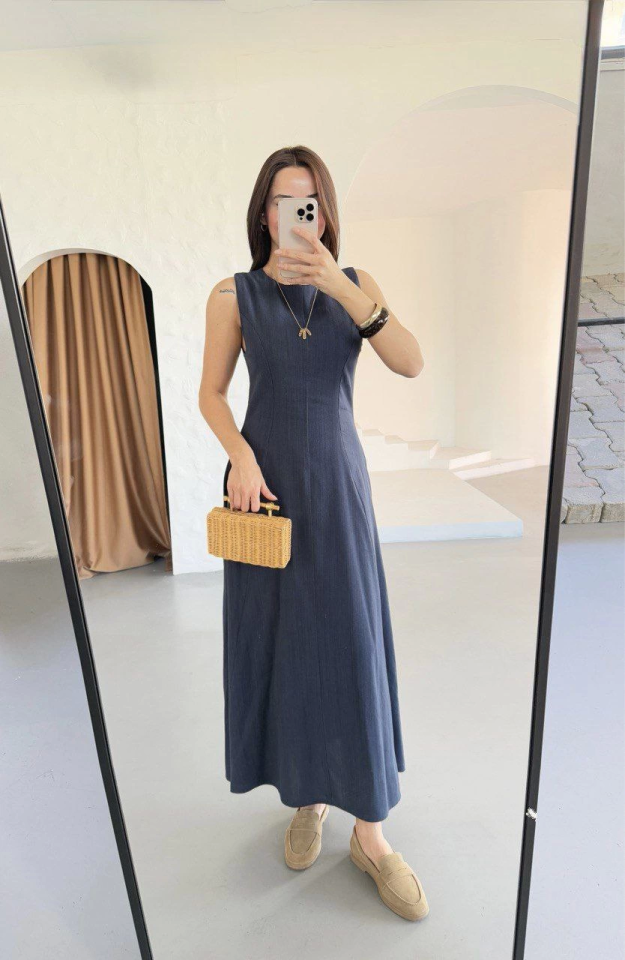 Keten Uzun Kolsuz Elbise- Mavi