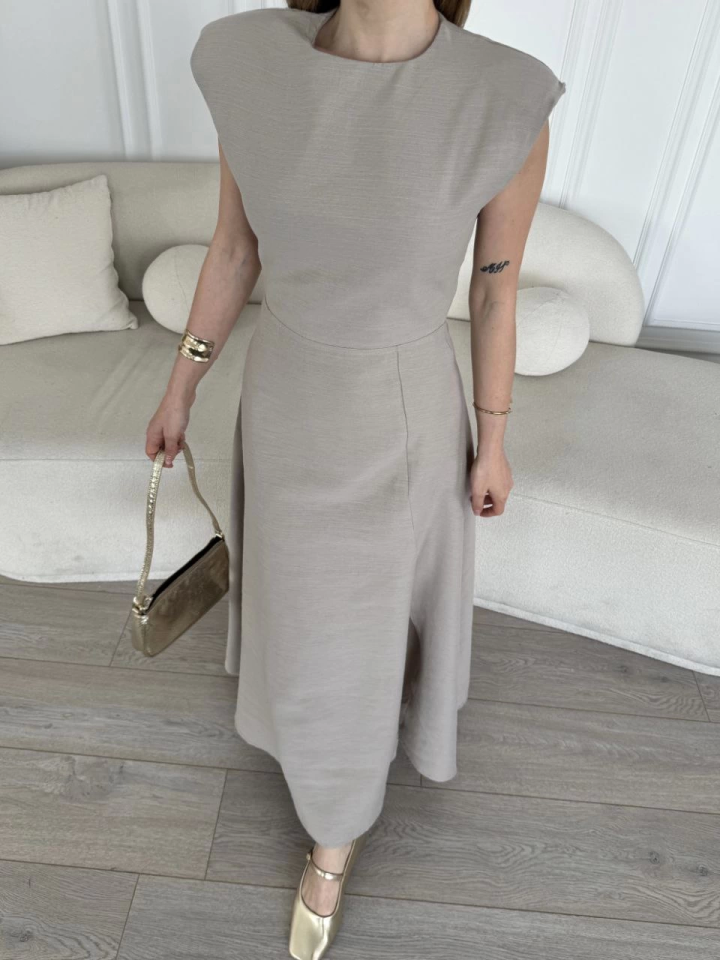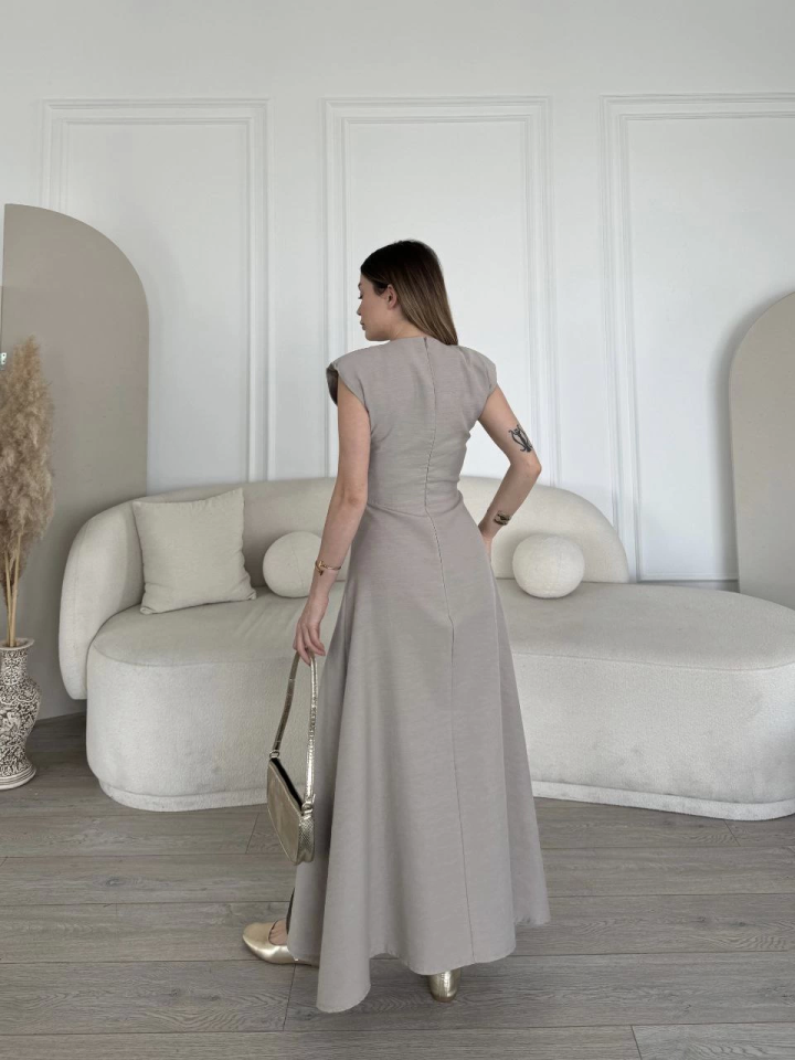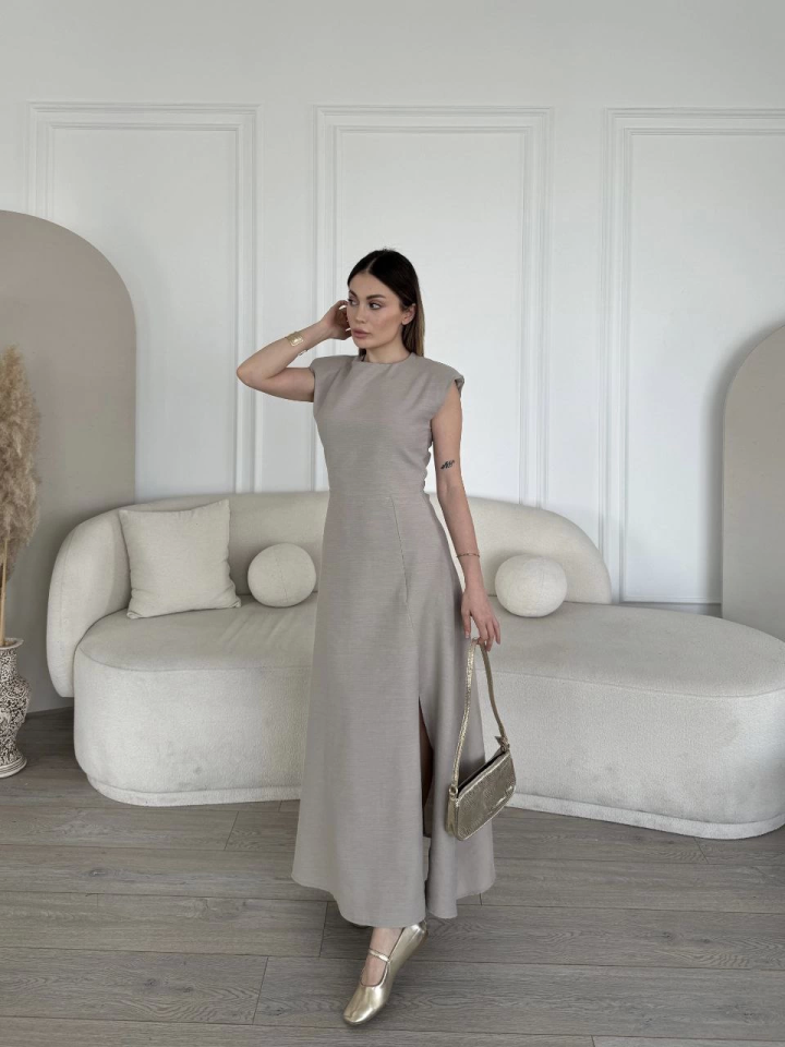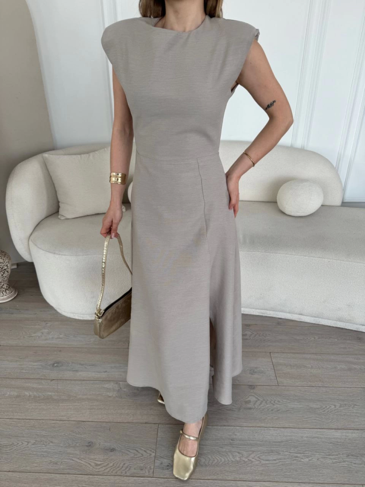 Keten Yandan Yırtmaçlı Uzun Sıfır Kolsuz Elbise – Gri