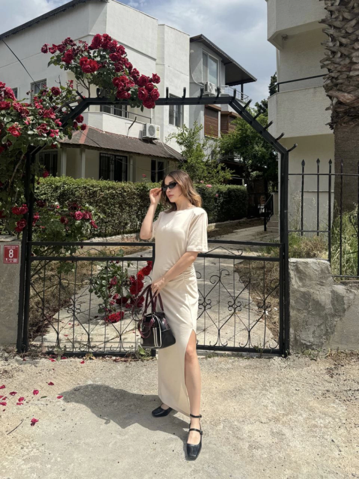 Kısa Kollu Uzun Yandan Yırtmaçlı Elbise – Beyaz