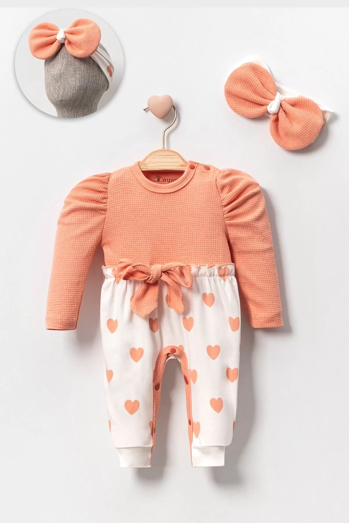 Kız Bebek Kalp Desenli Waffle Bandanalı 2’li Tulum