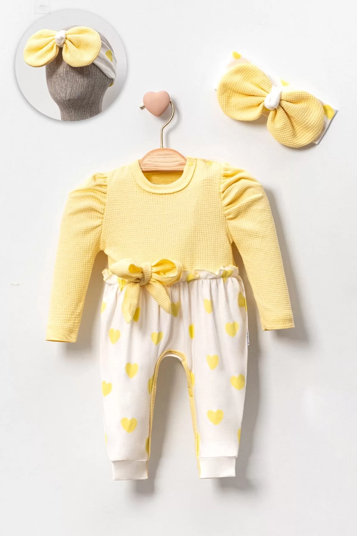 Kız Bebek Kalp Desenli Waffle Bandanalı 2’li Tulum