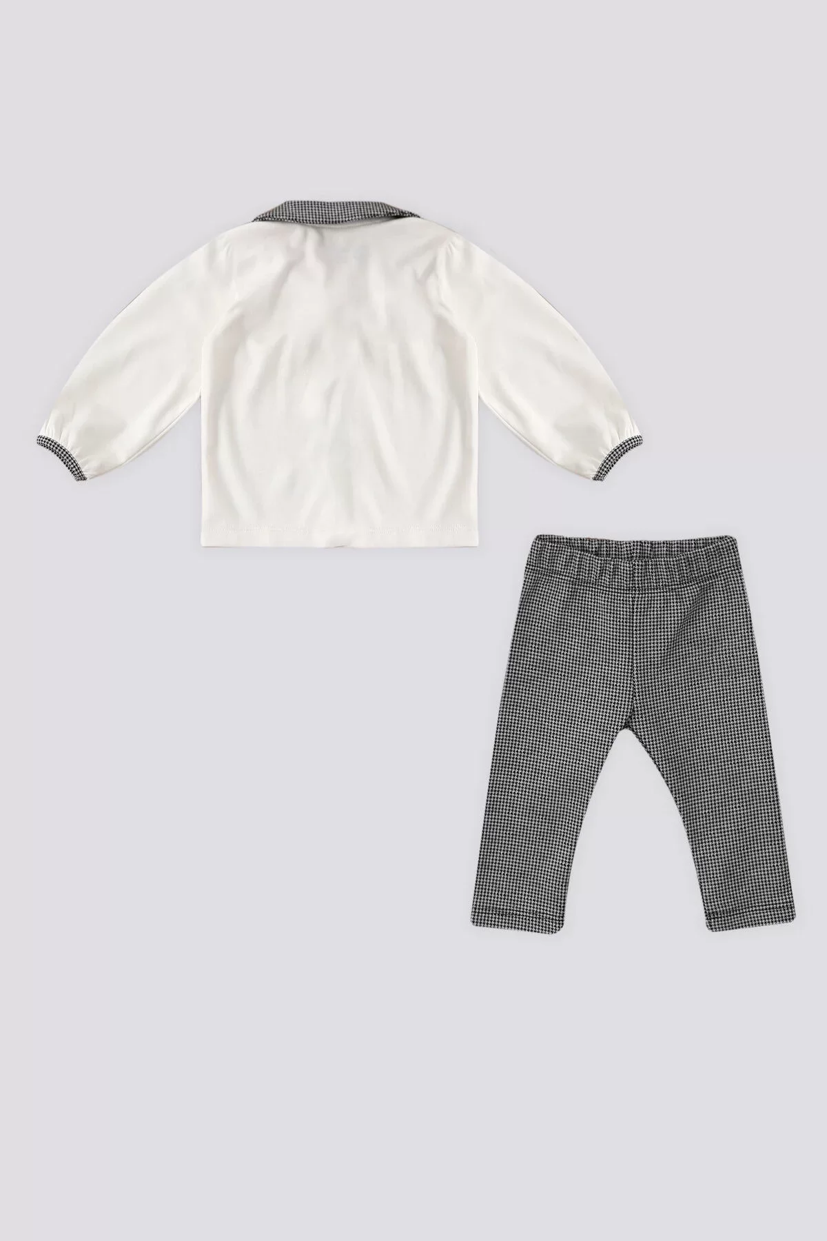 Bu takım, bebeğinizin gardırobuna şıklık ve konfor katacak bir seçenektir. Takımın üst kısmı, krem renginde bir üst ile tamamlanmıştır.